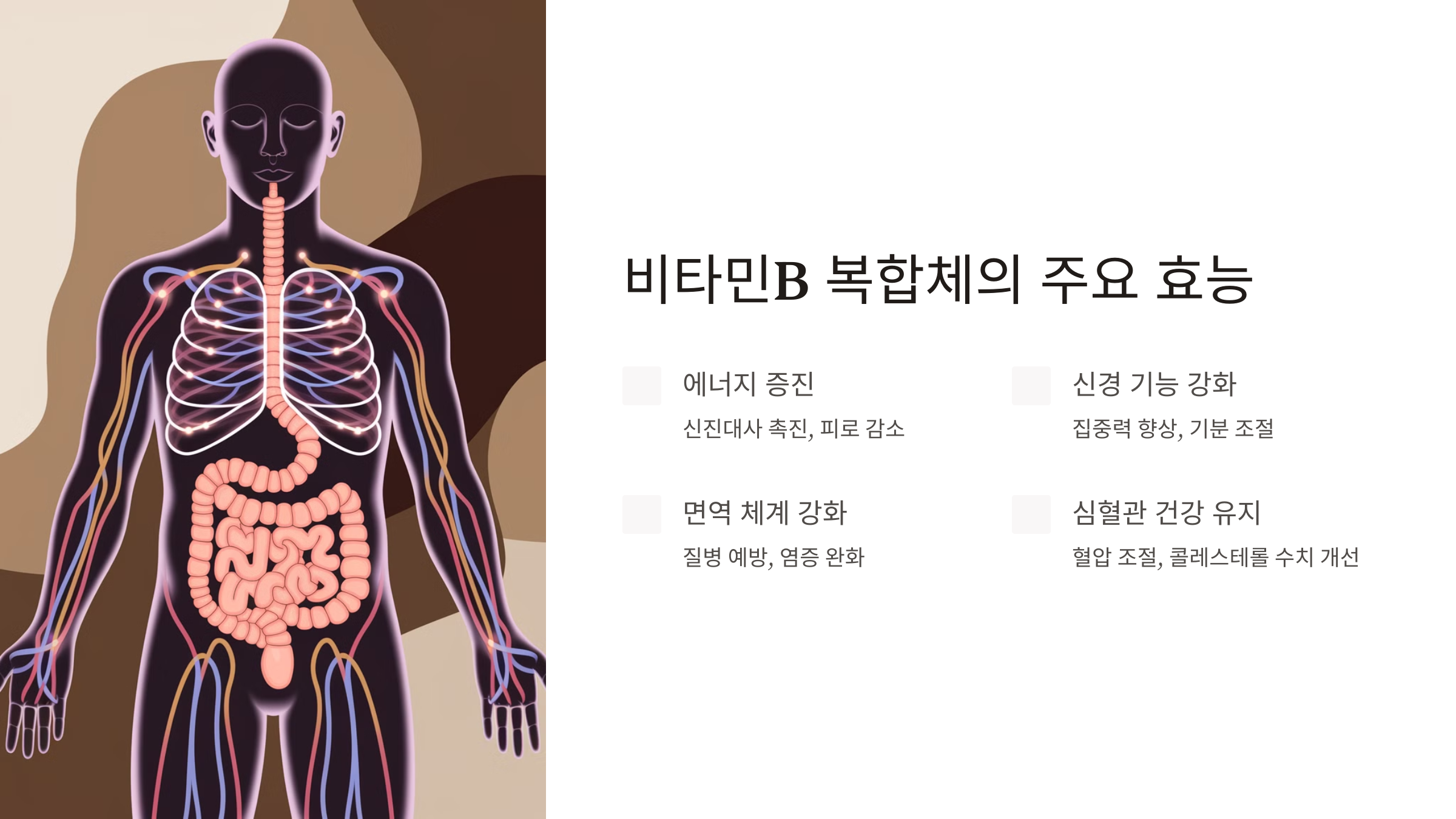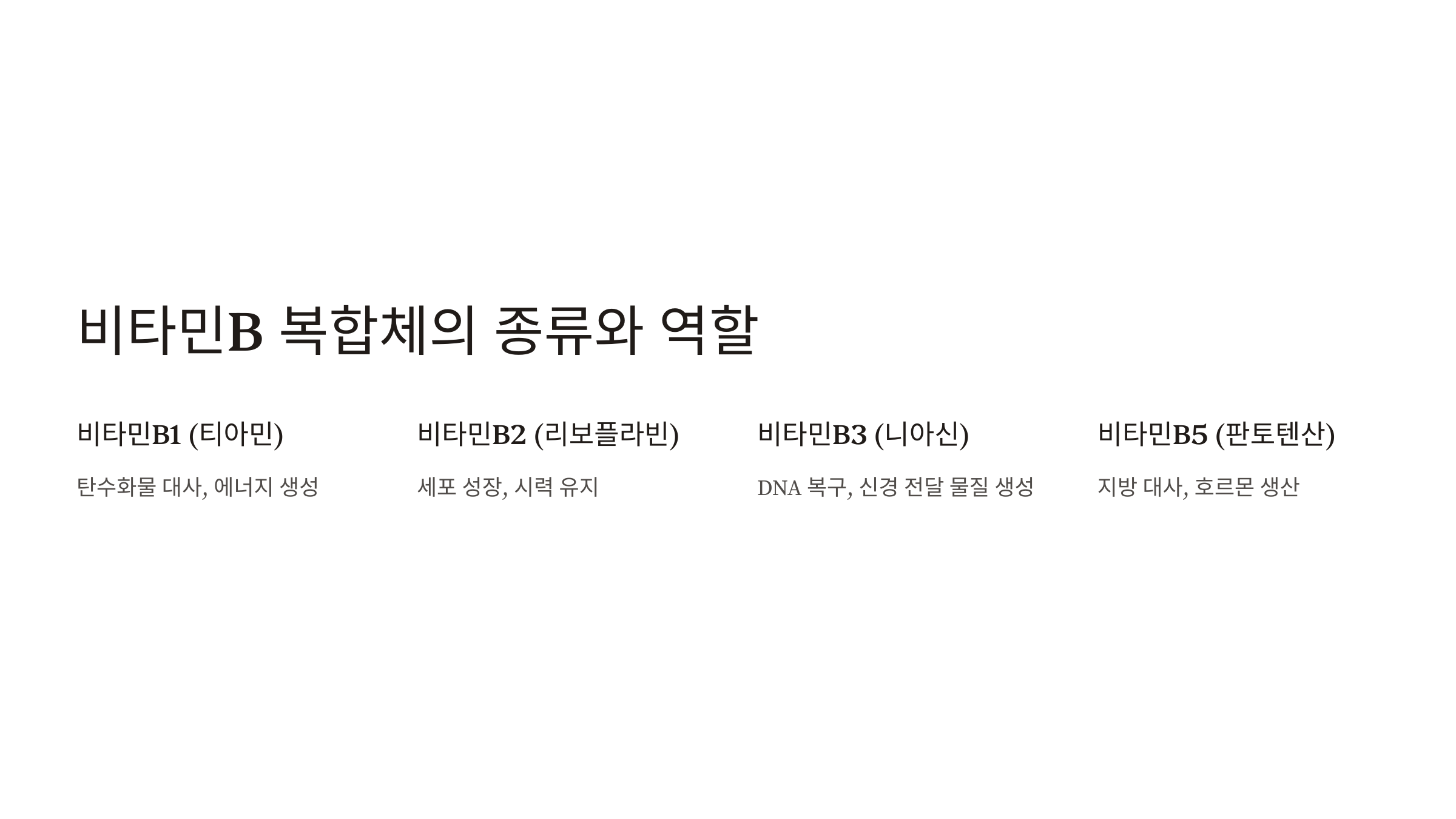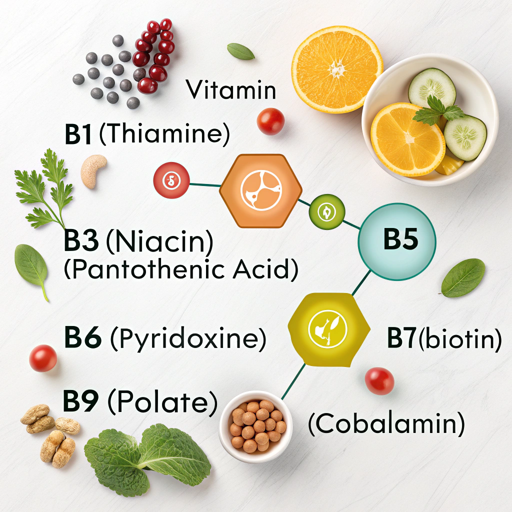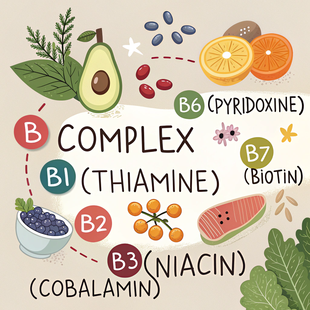 비타민B복합체는 각각의 비타민이 고유한 기능을 가지고 있어요. B1(티아민)은 신경계 건강과 에너지 생성에 필수적이며, B2(리보플라빈)는 세포 성장과 복구를 지원해요. B3(나이아신)는 콜레스테롤 수치를 조절하고 혈액순환을 돕는 데 중요한 역할을 하죠.