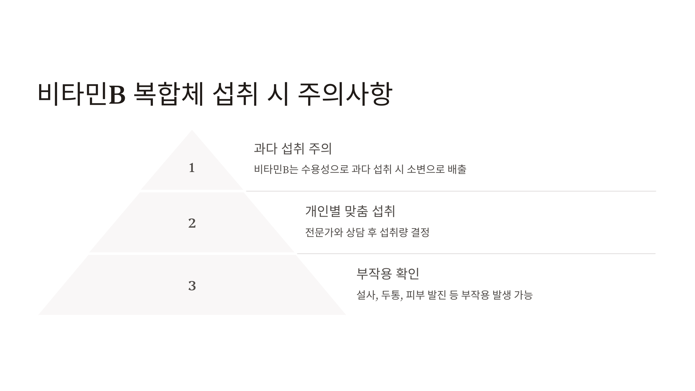 비타민B복합체는 대체로 과다 섭취해도 소변으로 배출되기 때문에 비교적 안전하지만, 과량 섭취는 위장 장애, 피부 트러블, 신경 손상 등을 유발할 수 있어요. 권장량을 항상 지키는 것이 중요해요.