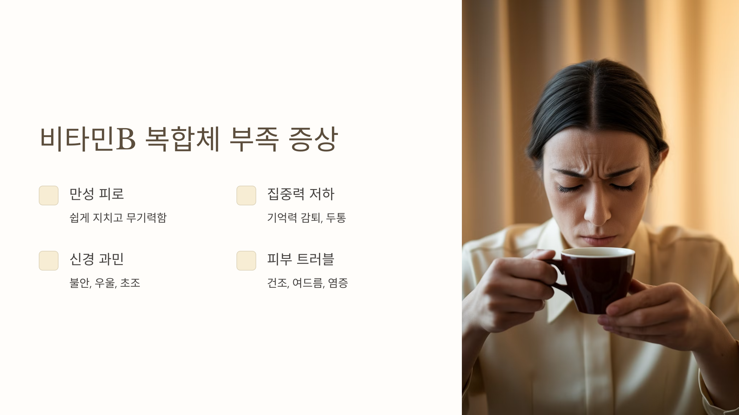 비타민B 복합체가 부족하면 신체와 정신에 다양한 증상이 나타날 수 있어요. 가장 흔한 증상은 만성 피로와 무기력감이에요. 에너지 대사가 원활하지 않아 신체가 쉽게 지치게 되는 거죠.
