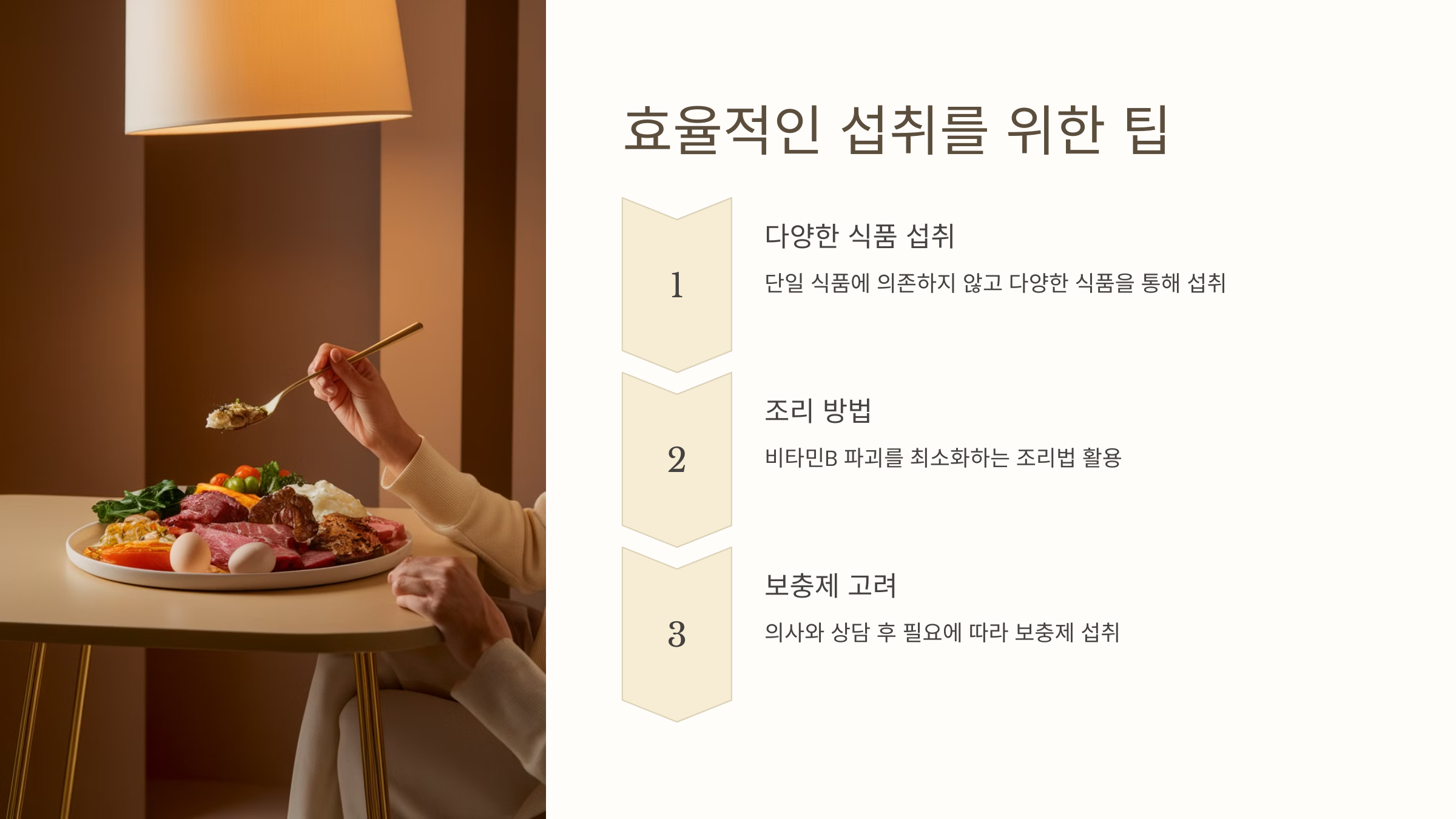 만약 식단으로 충분히 섭취하기 어렵다면, 비타민B 복합체 보충제를 활용하는 것도 추천돼요. 하루 권장량을 초과하지 않도록 주의하며, 제품의 성분표를 꼼꼼히 확인하세요.
