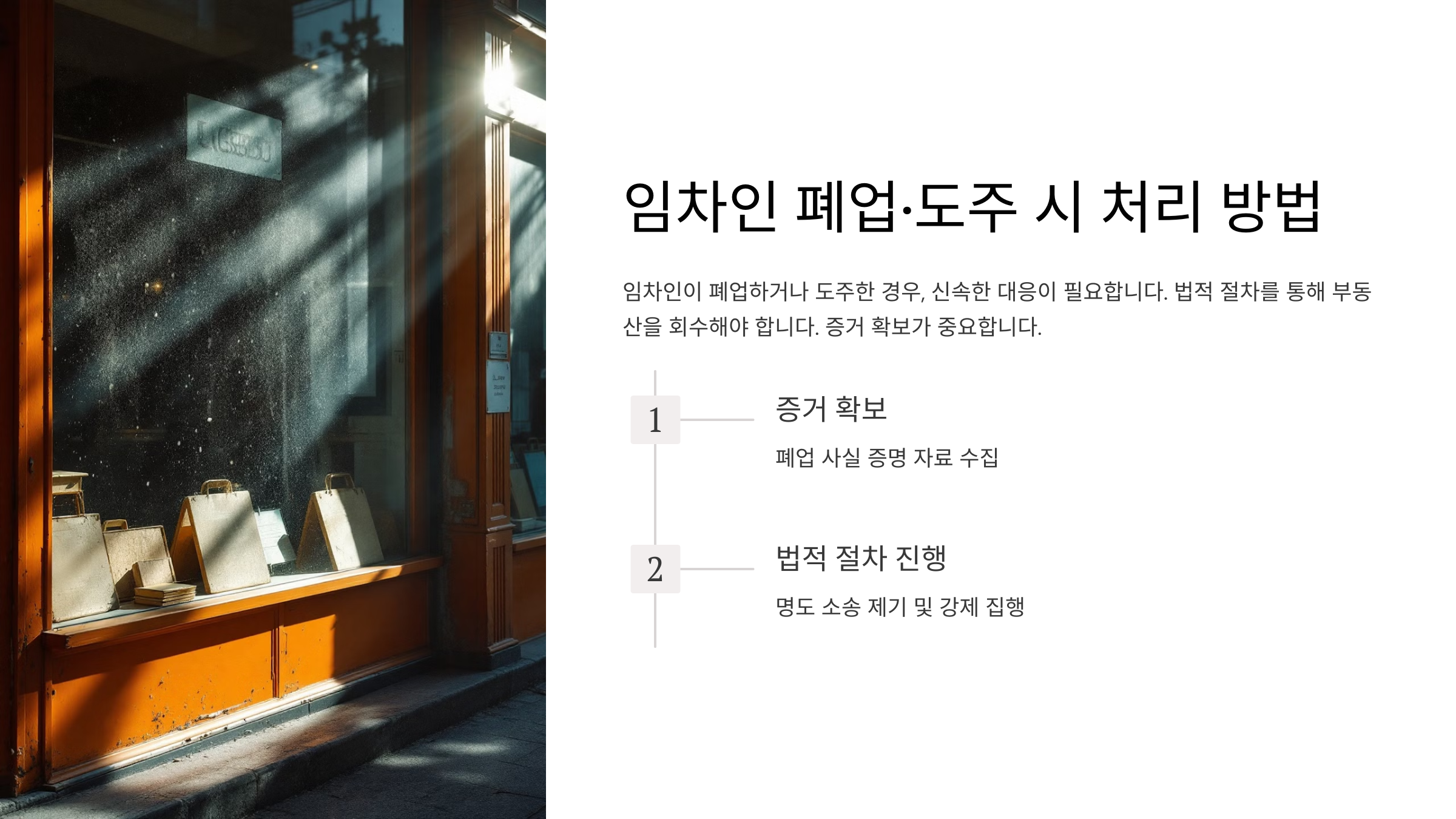 임차인이 도망가거나 폐업했더라도 법적인 절차 없이 건물을 점유하면 오히려 건물주가 불리해질 수 있어요. 따라서 명도 소송과 강제집행 절차를 반드시 따라야 해요! ⚖️