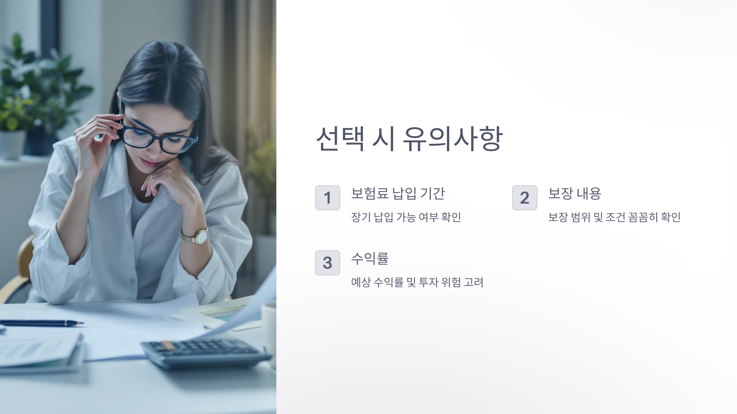 셋째, 보험사의 신뢰도도 중요한 선택 기준이에요. 장기적으로 유지해야 하는 상품이기 때문에 보험사의 재정 안정성과 고객 서비스가 뛰어난지 확인하세요. 평판이 좋은 보험사를 선택하면 더 안심하고 운용할 수 있어요.