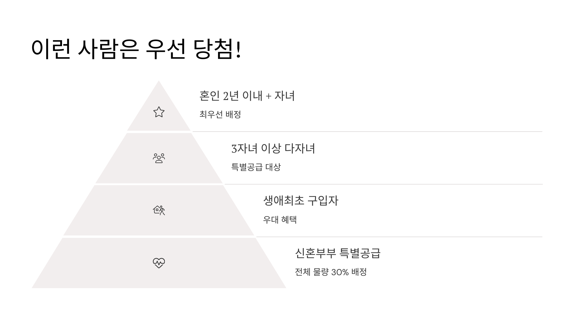 또한 월 소득이 도시근로자 평균소득의 70% 이하인 경우에도 우선공급이 가능해요. 다만 우선공급 물량은 전체 공급의 30~50%로 제한되어 있기 때문에, 일반공급 신청자도 반드시 대비해야 해요.