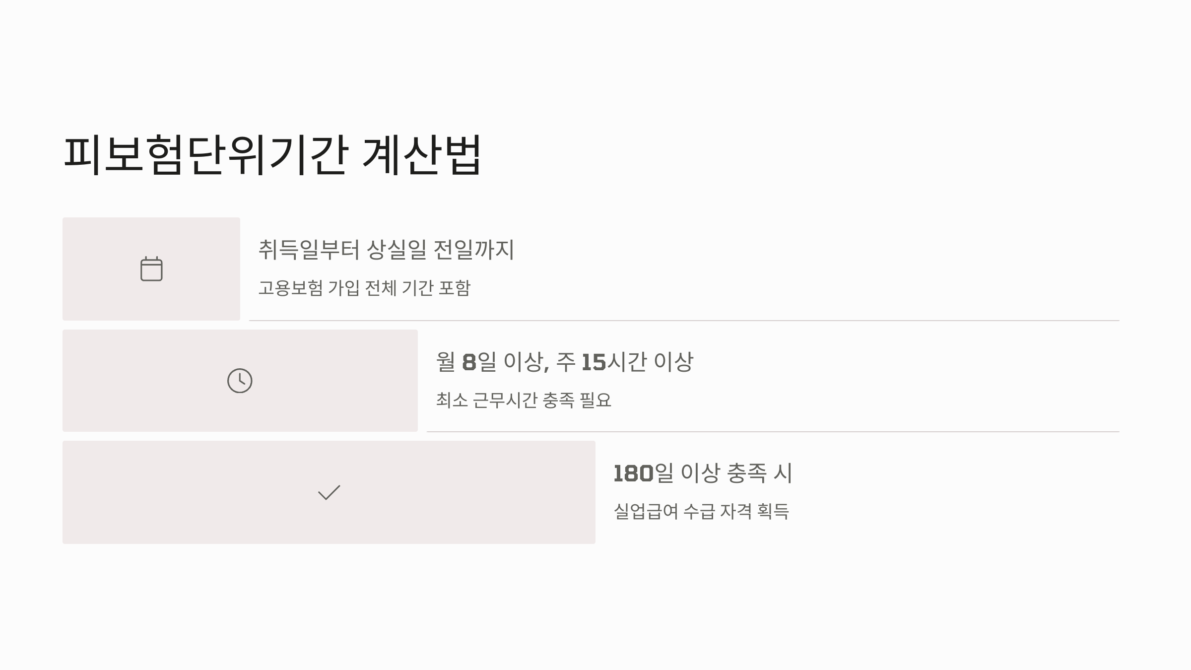 따라서 자신이 하루 4시간 미만 일하거나 주 3일 이하로 일한 경우, 고용보험 가입이 되어 있더라도 단위기간이 짧을 수 있어요. 이럴 땐 ‘피보험단위기간 계산기’나 고용보험센터를 통해 실제 계산된 일수를 확인하는 것이 안전해요.