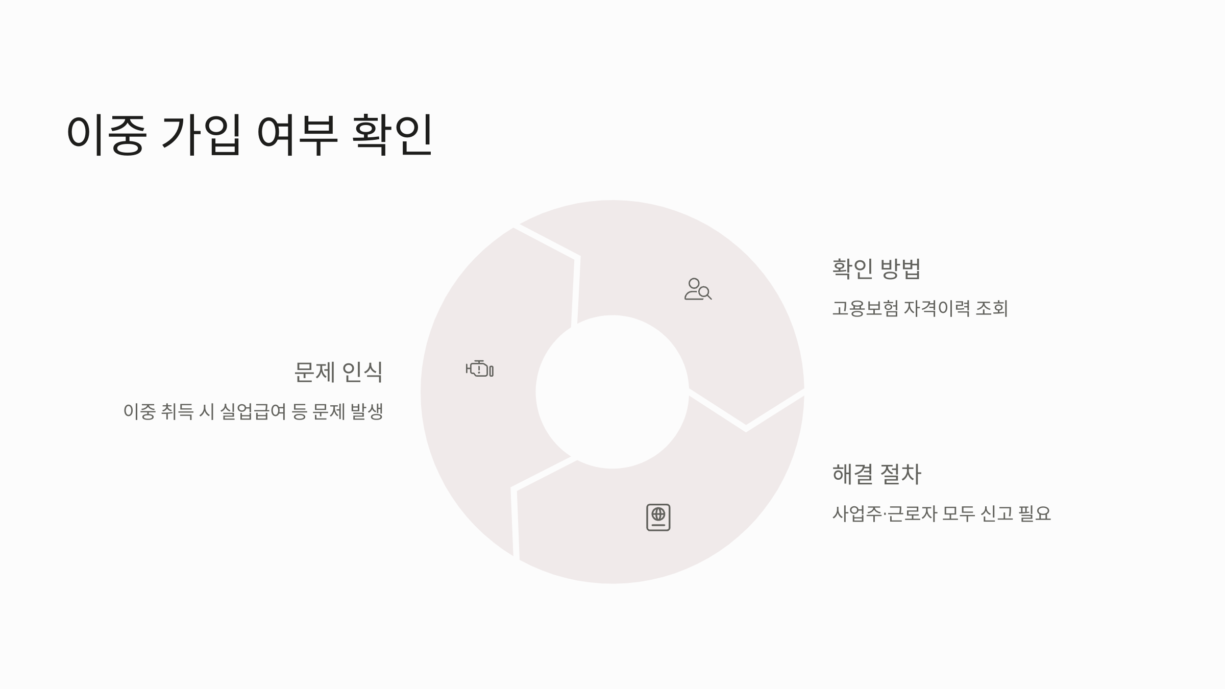 이중 가입 여부는 고용보험 홈페이지의 ‘자격조회’ 또는 국민연금/건강보험 자격정보와 대조하여 확인할 수 있어요. 가장 정확한 방법은 고용노동부 고객센터(1350)로 전화해 확인하는 거예요.