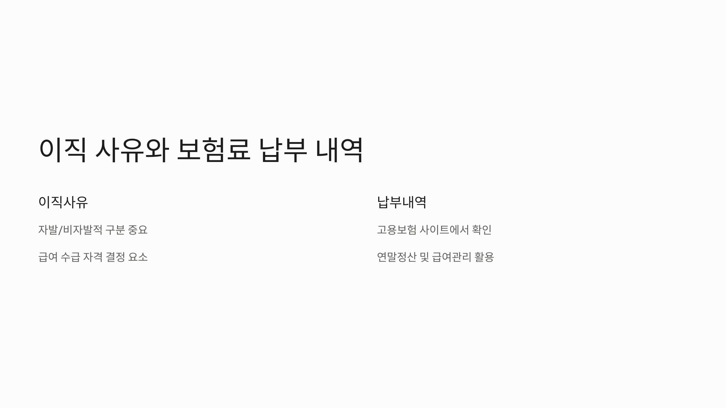 | 이직 사유 | 자발적/비자발적 퇴사 여부 | 사유에 따라 수급 여부 결정 |