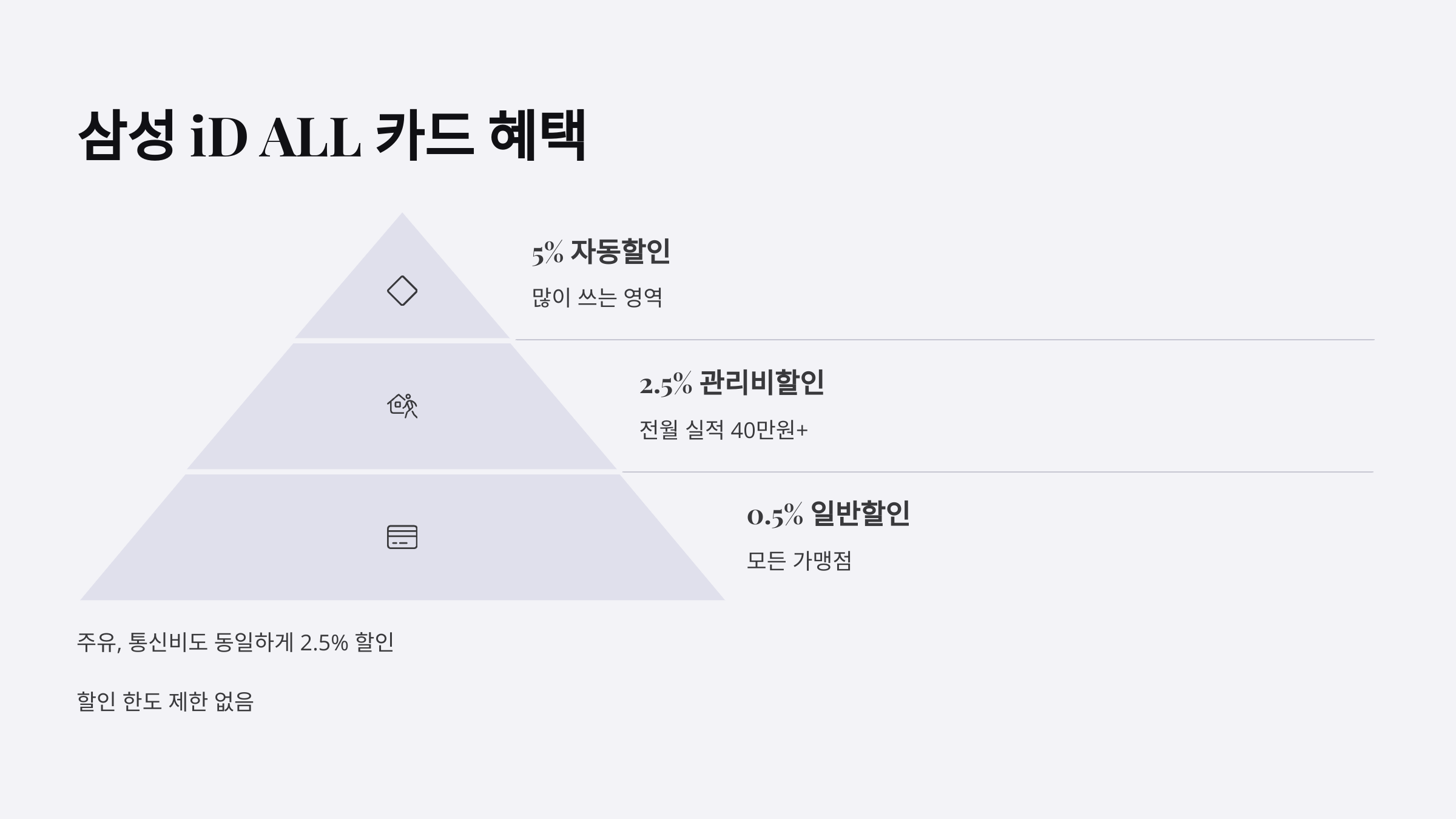 | 삼성 iD ALL | 2.5% | 관리비 결제일 할인 | 관리비만 집중 절약할 때 |