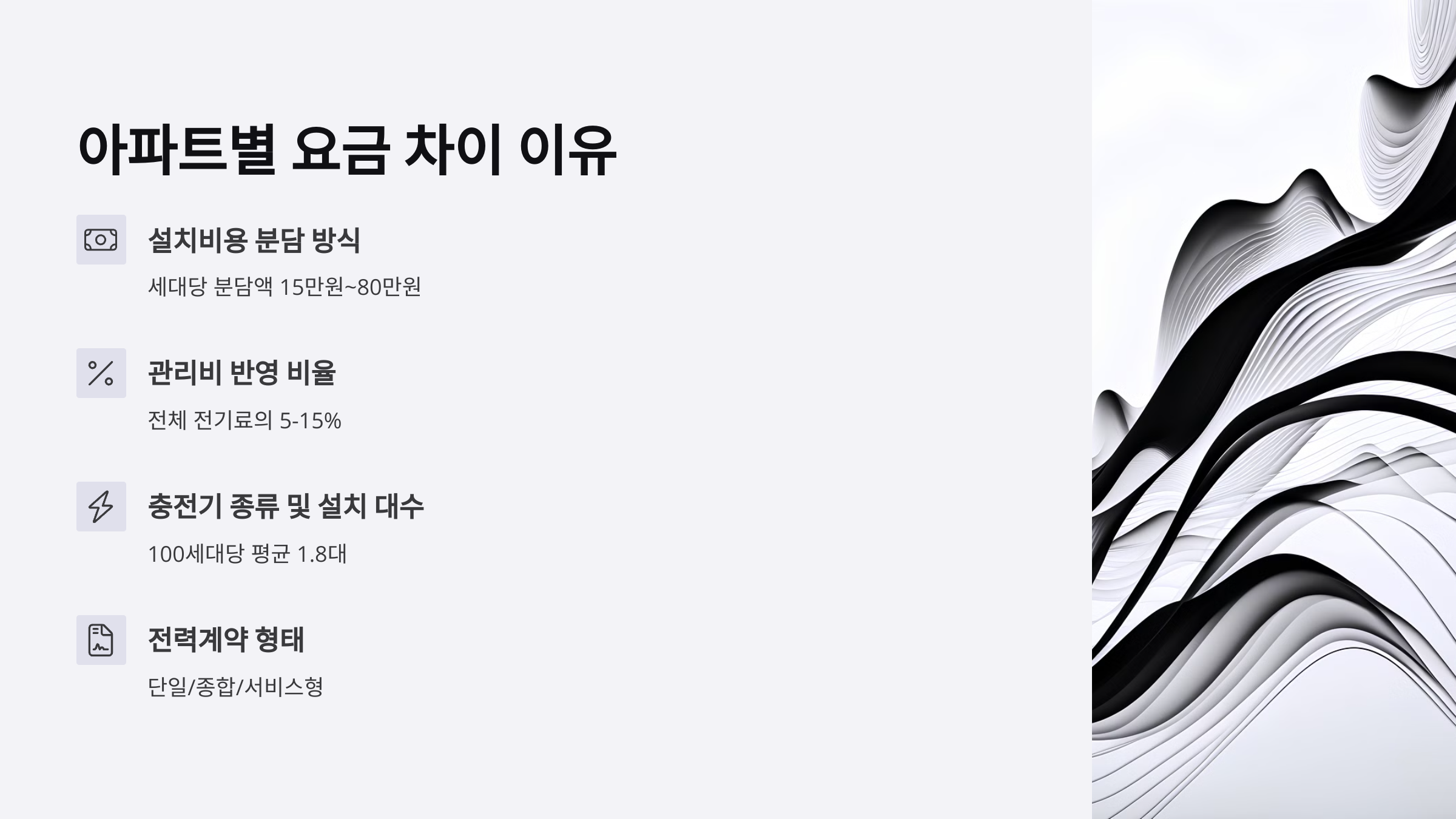 첫 번째 이유는 설치비 부담 여부입니다. 어떤 아파트는 충전설비 설치비를 입주민이 공동 부담하고, 어떤 곳은 업체가 설치비를 대신 내요. 설치비를 누가 부담했느냐에 따라 요금이 달라질 수 있어요.