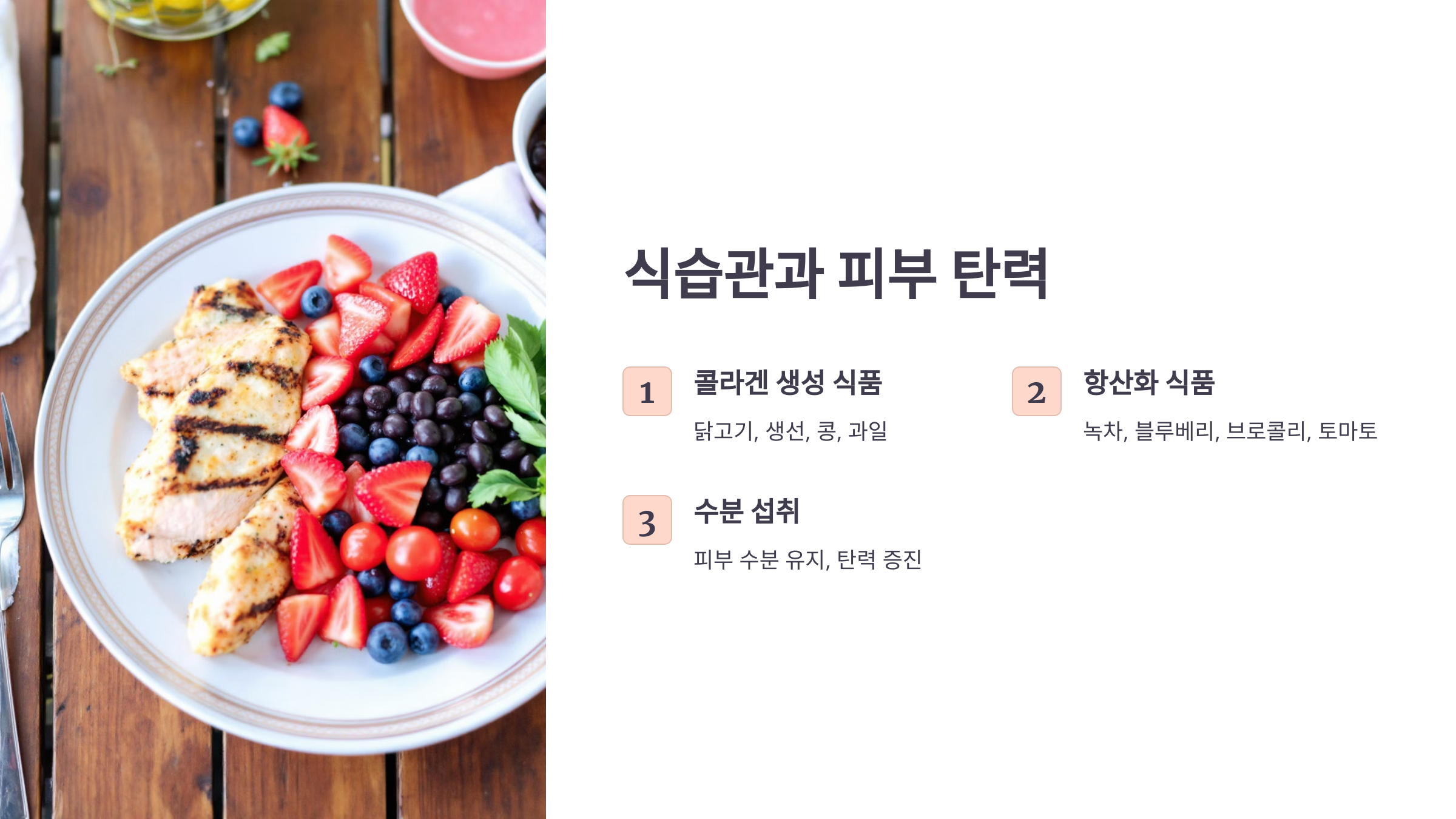 피부 탄력을 유지하는 데 식습관이 얼마나 중요한지 아시나요? 건강한 피부를 위해서는 탄력을 높이는 영양소가 풍부한 음식을 섭취해야 해요. 특히, 단백질은 콜라겐 생성의 기본 재료로 매우 중요한 역할을 해요. 생선, 닭고기, 두부 같은 고단백 음식을 균형 있게 섭취해 보세요.