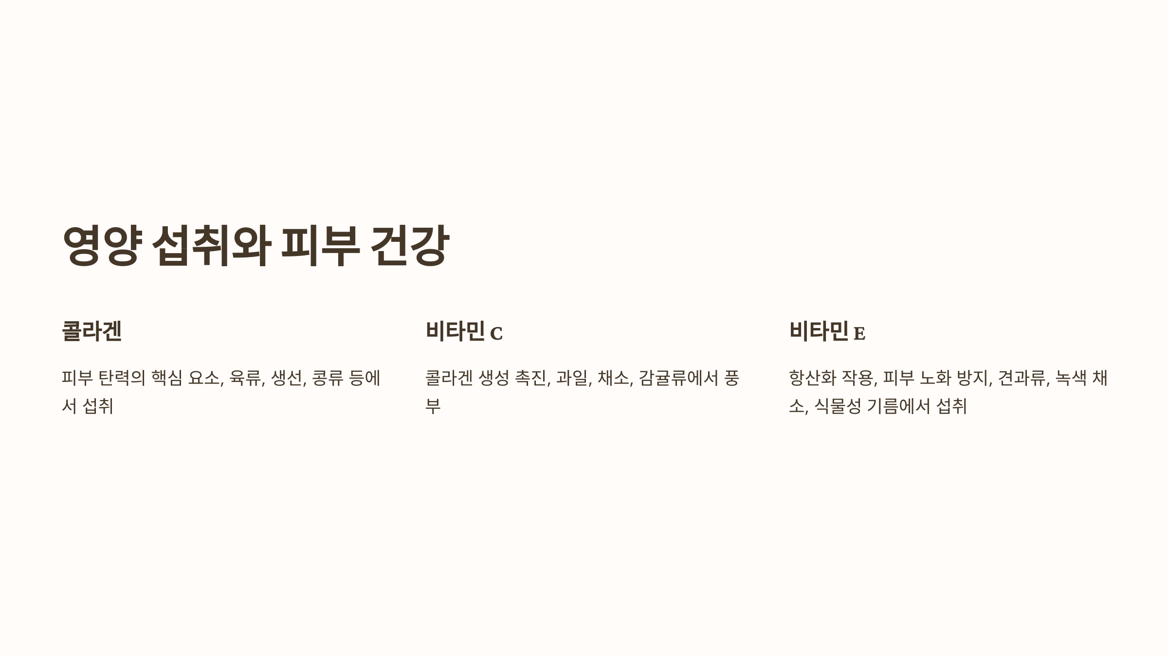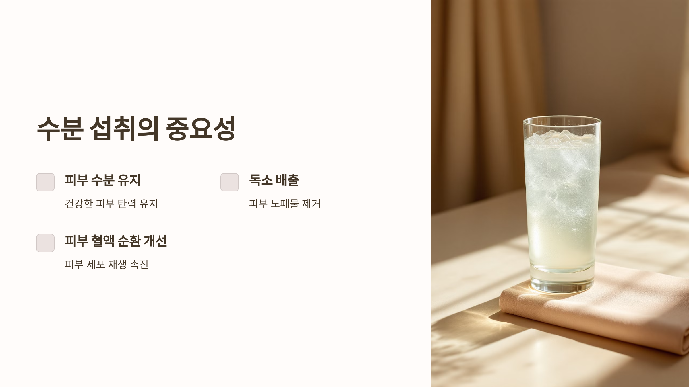 균형 잡힌 식단과 함께 충분한 물 섭취도 중요해요. 수분이 부족하면 피부가 건조해지고 탄력을 잃기 쉬우니, 하루 8잔 이상의 물을 마시는 습관을 들이는 것이 좋아요.