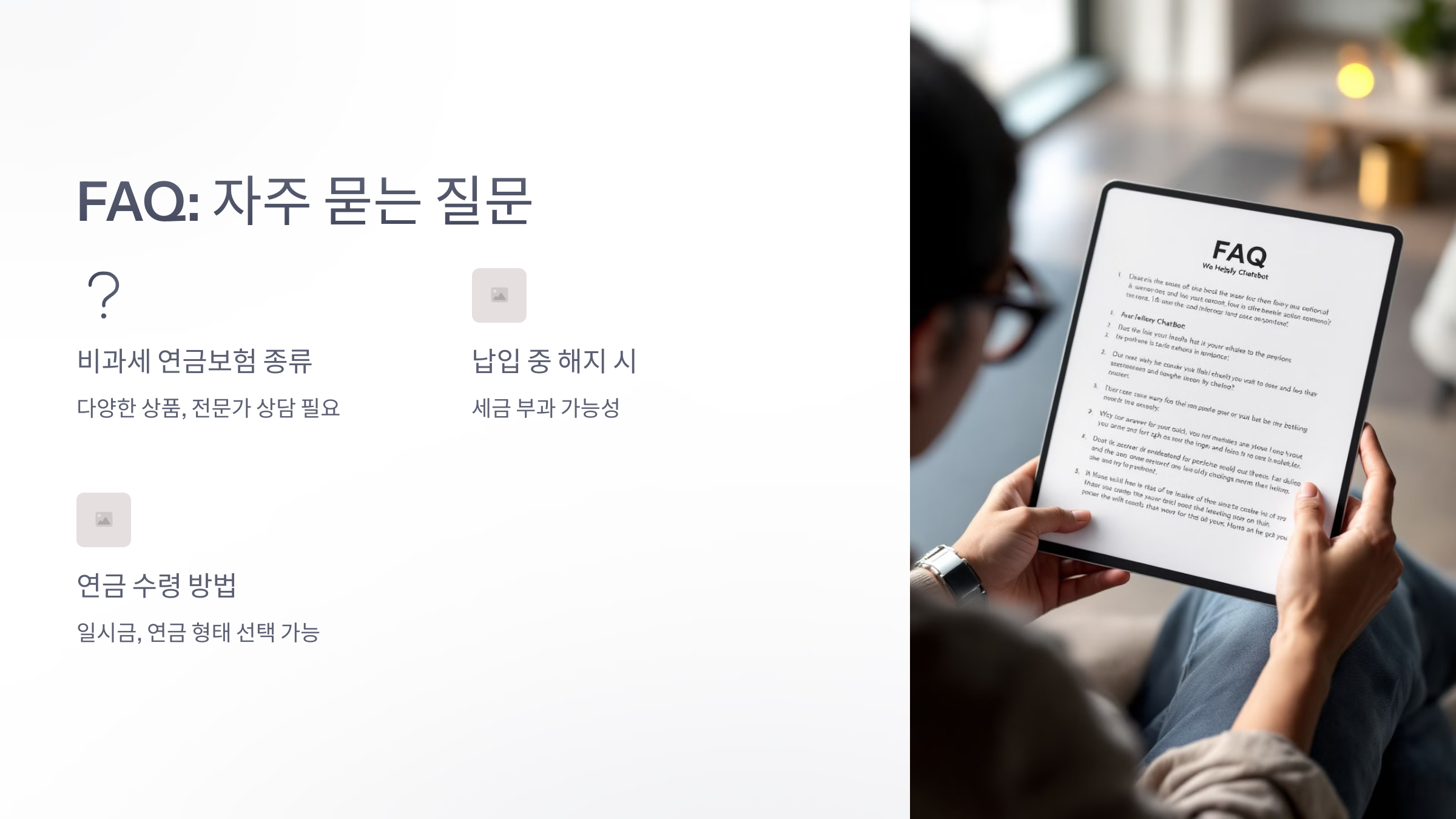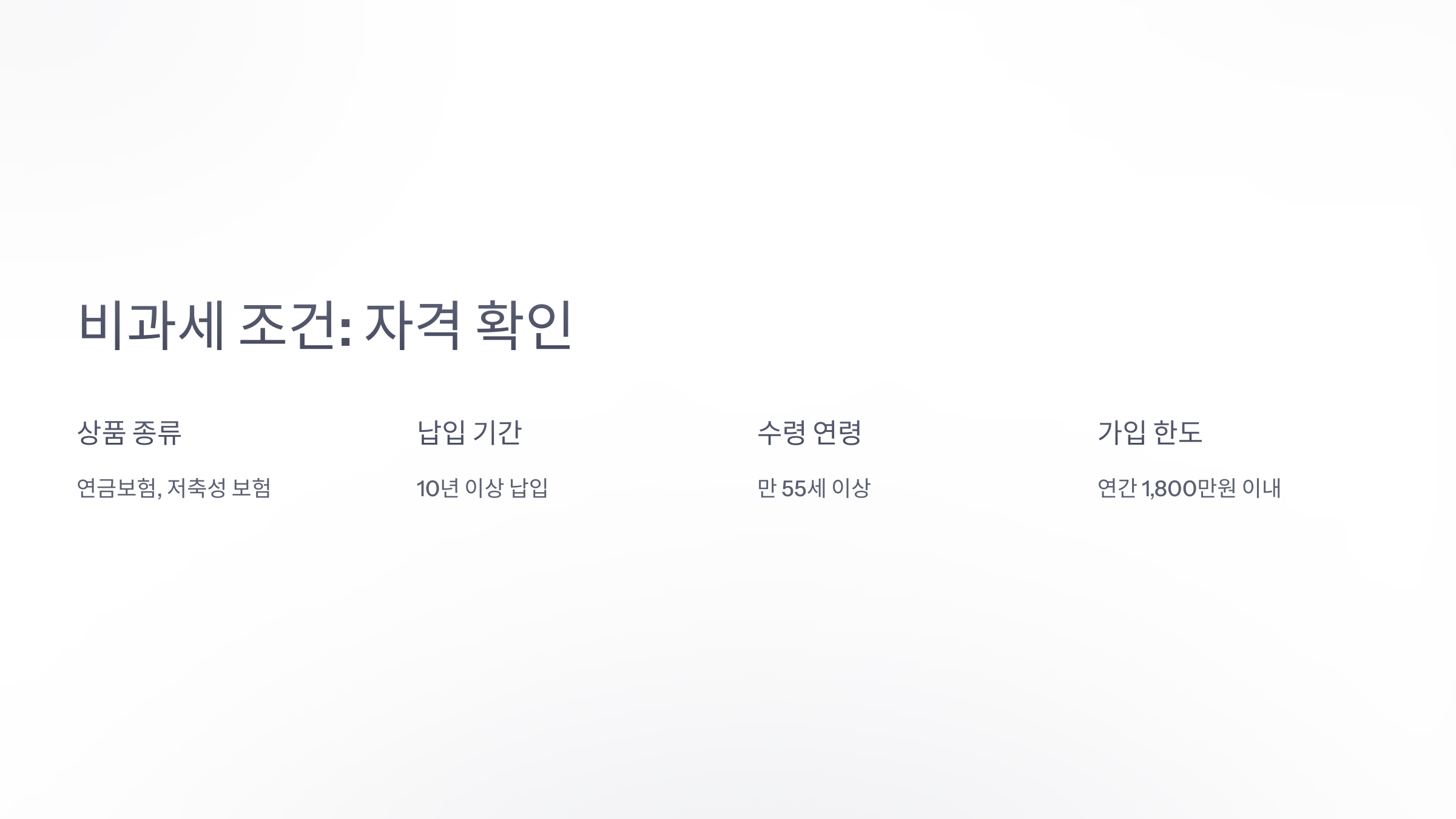 A1. 아니요. 가입 기간, 보험료 납입 한도, 수령 나이 등 조건을 충족해야 비과세 혜택을 받을 수 있어요.