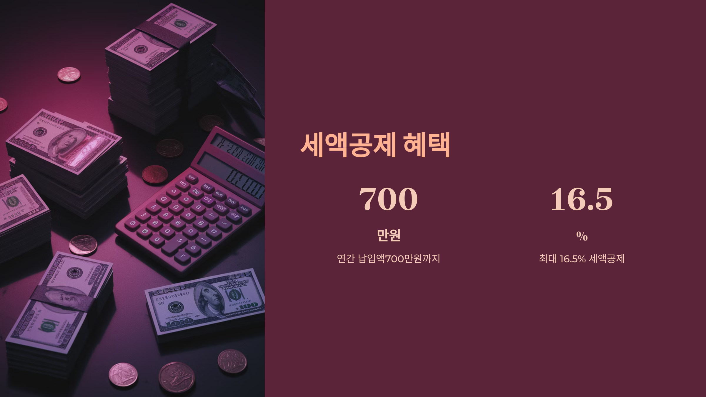 | 세제 혜택 | 세액공제 가능 (연 최대 66만 원) | 없음 |