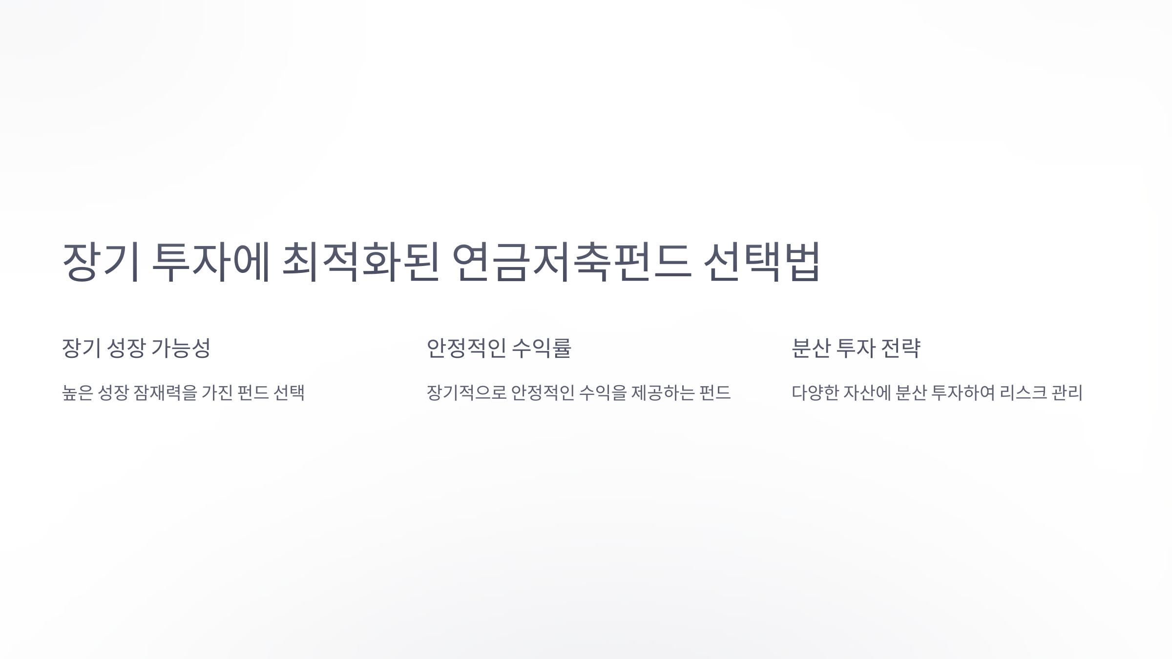 연금저축펀드를 선택할 때 가장 중요한 요소는 ‘장기 투자에 적합한지’ 여부예요. 단기적으로 수익이 좋더라도 변동성이 크다면 오히려 장기적으로 손해를 볼 수도 있어요. 그렇기 때문에 안정적인 성과를 낼 수 있는 펀드를 선택하는 것이 핵심이에요.