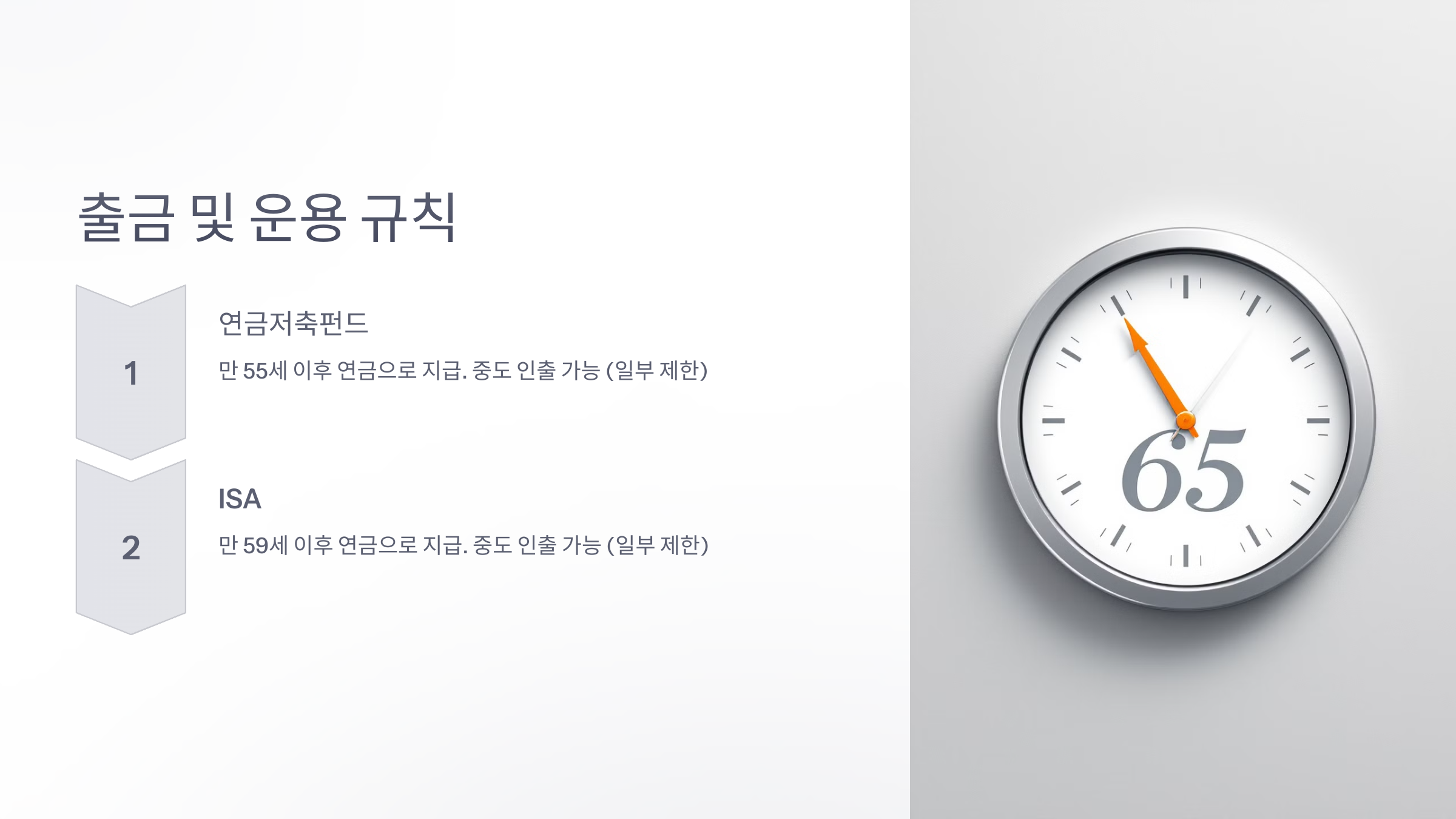 | 출금 조건 | 55세 이후 연금 수령 | 5년 후 자유 인출 가능 |