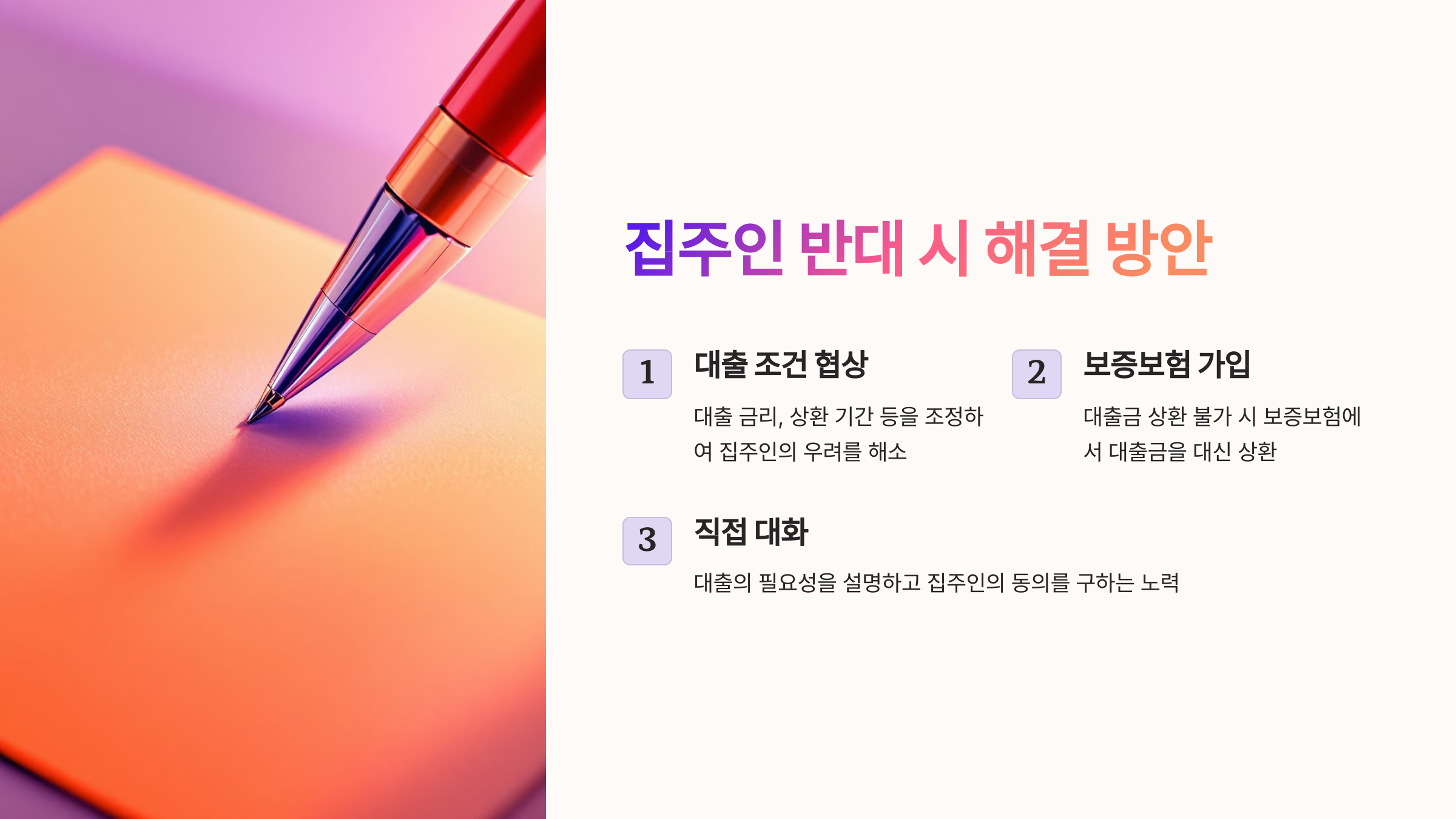 - ✅ 대출 상품 선택 신중 – 집주인 동의 없이 가능한 상품을 선택하면 불필요한 갈등을 줄일 수 있어요.