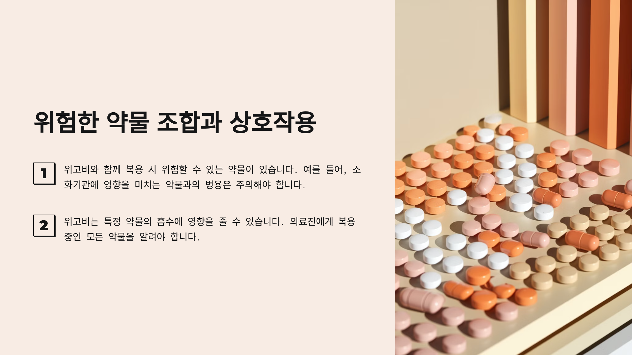 위고비는 다른 약물과 병행할 경우 예상치 못한 부작용이 발생할 수 있어요. 특히 혈당을 낮추거나 위장 운동에 영향을 주는 약물과 함께 복용하면 위험할 수 있어요! 🚨