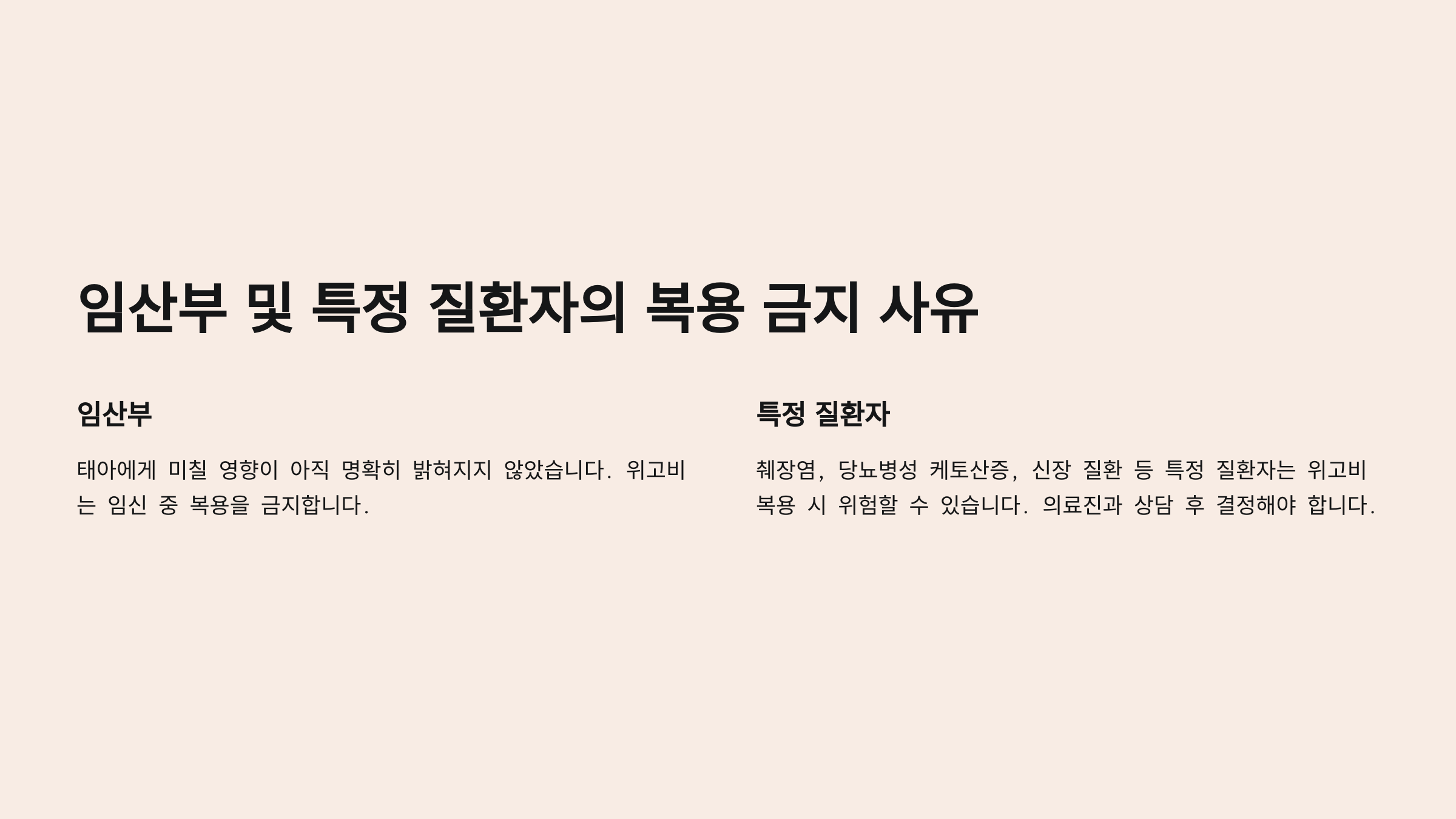 - 🔥 췌장염 병력자 → 위고비는 췌장에 부담을 줄 수 있어 재발 위험이 있음