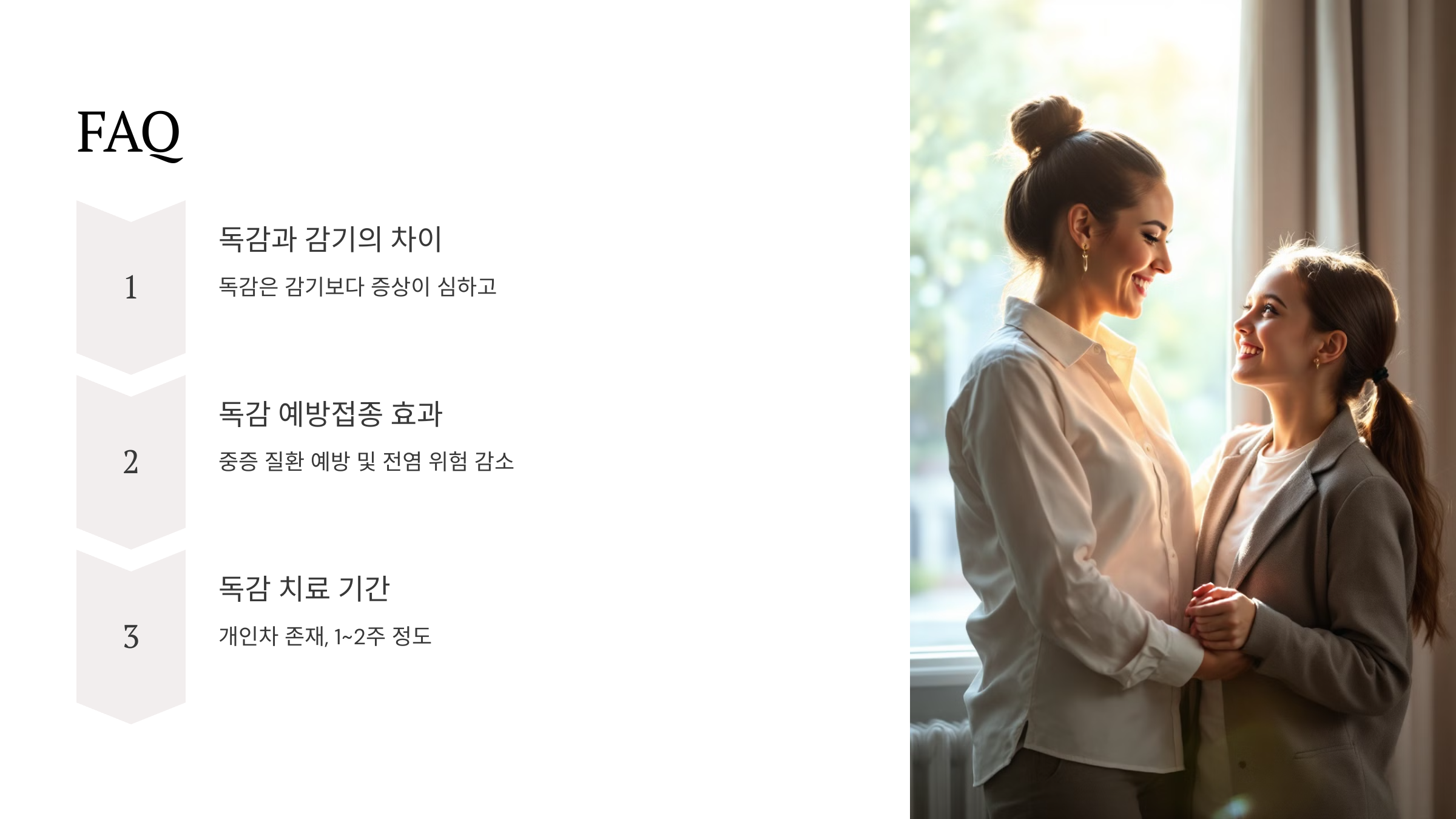 A5. 독감은 바이러스 변이에 따라 재감염될 수 있으므로 예방접종이 중요해요.
