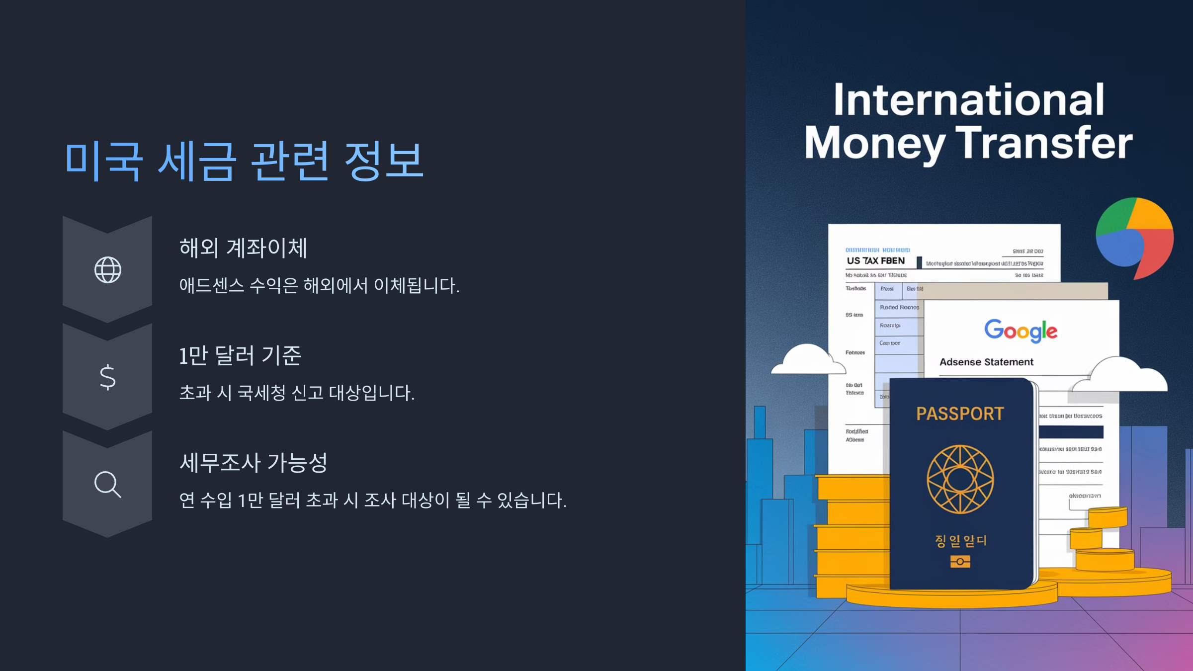 유튜브 수익은 미국 구글 본사에서 지급되기 때문에, 반드시 미국 세금 정보(Tax Info)를 제출해야 해요. 이거 안 하면 세금 24% 떼이고 시작해요! 😱