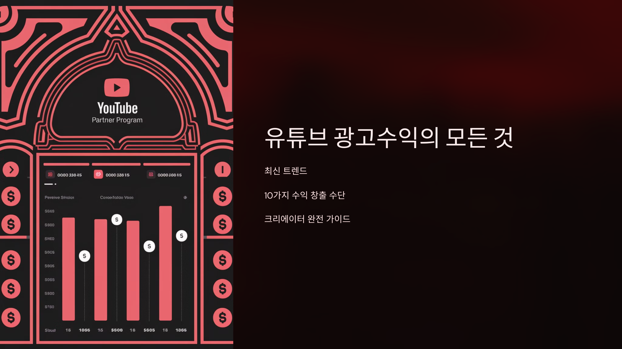 대표적인 수익원은 디스플레이 광고, 중간광고, 시작 전 광고, 배너 광고예요. 이 광고들이 영상에 붙고, 시청자가 보거나 클릭하면 수익이 발생하죠.