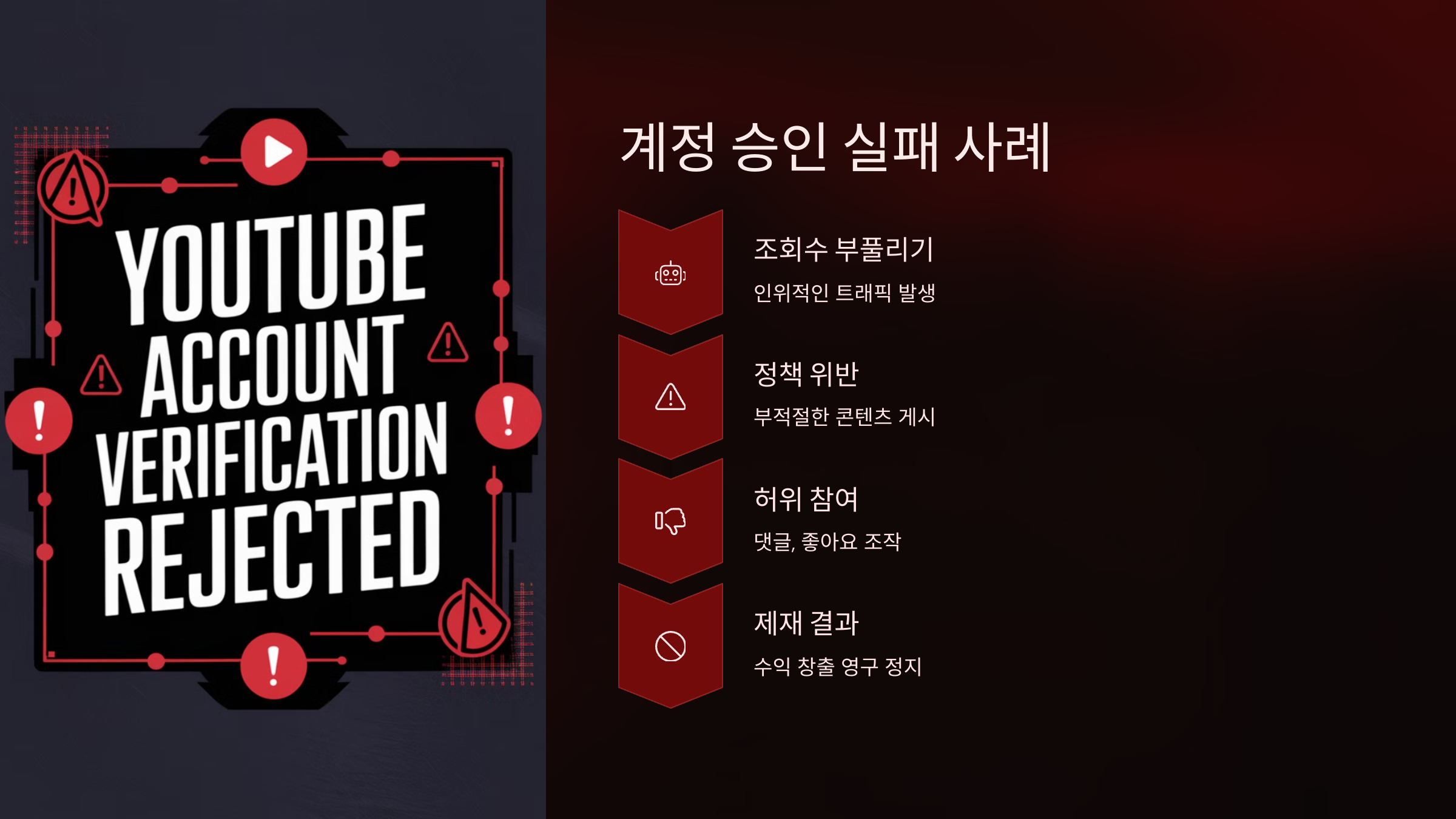 대표적인 실패 원인으로는 ① 콘텐츠 중복, ② 무단 음악 사용, ③ 정치·선정성 문제, ④ 가이드 위반 이력 등이 있어요.