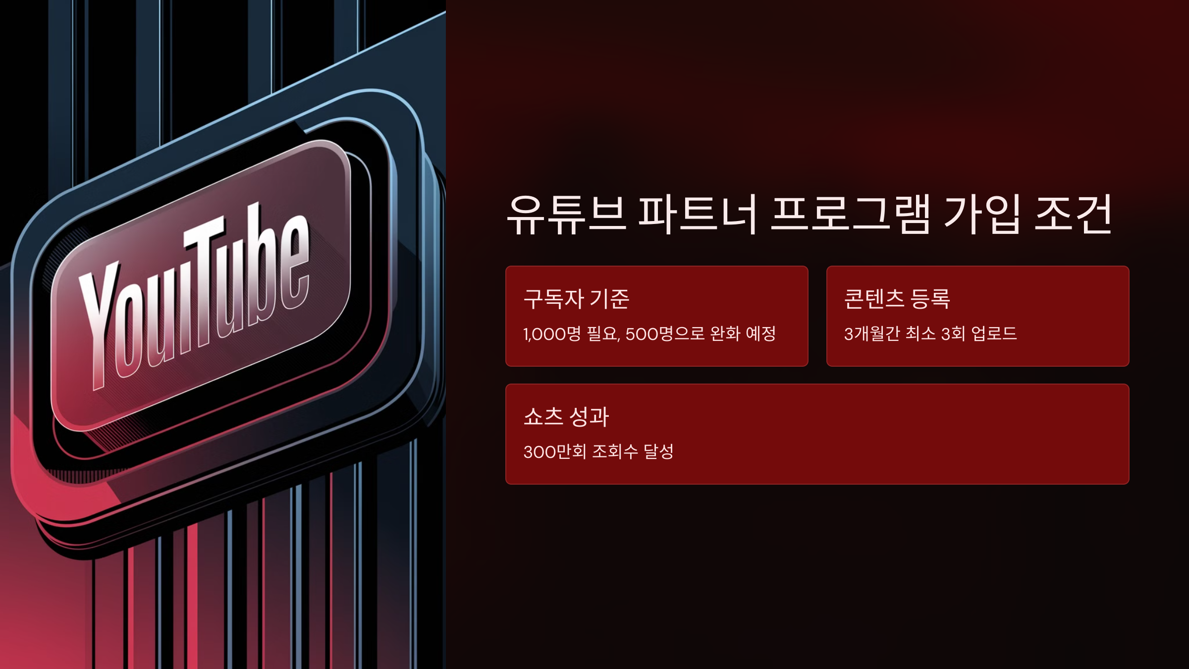 조건은 다음과 같아요. ① 구독자 1000명, ② 최근 12개월 시청 시간 4000시간 또는 쇼츠 1000만 조회수 중 하나만 만족하면 신청 자격이 돼요.