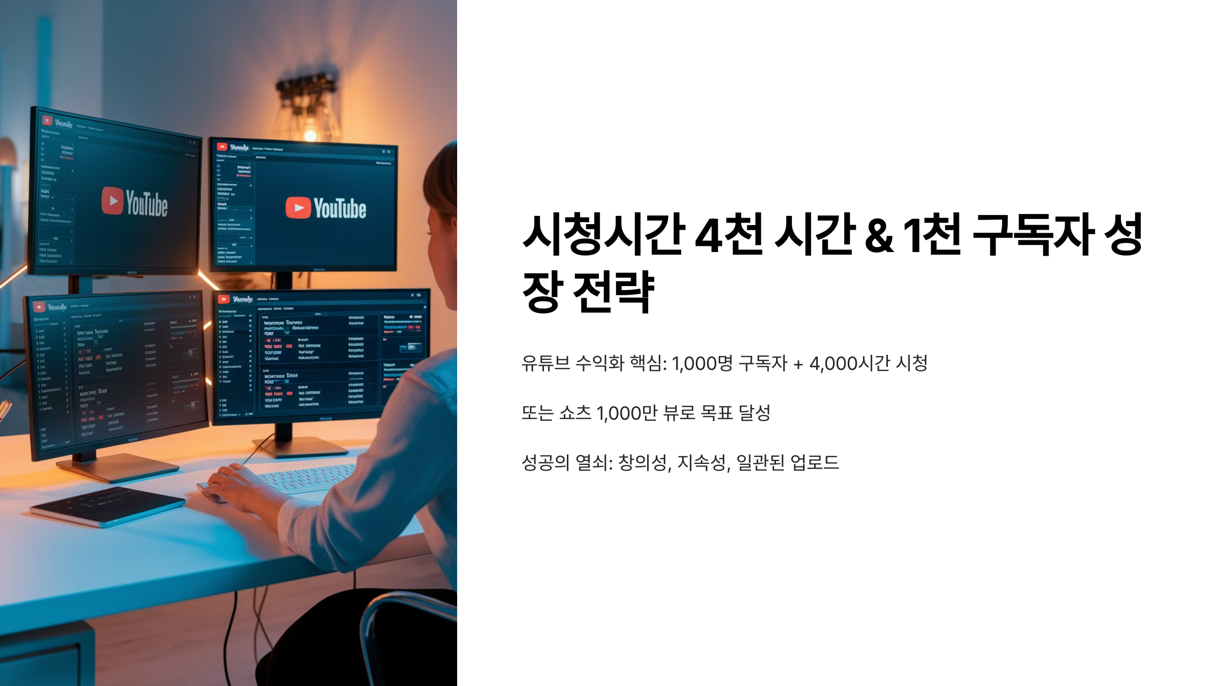 유튜브 수익을 만들려면 구독자 1,000명과 시청시간 4,000시간이 필수 조건이죠! 그런데 아무 생각 없이 시작하면 이걸 채우는데 1년이 넘게 걸릴 수도 있어요. 😢