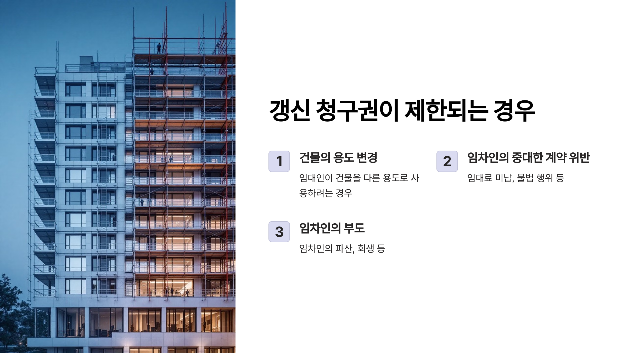 임대인 역시 몇 가지 예외적인 경우에만 갱신 청구권을 거부할 수 있어요. 대표적인 예로, 임대인이 해당 주택에 직접 거주할 계획이 있는 경우, 또는 계약 종료 후 주택을 철거하거나 재건축하려는 계획이 있는 경우예요. 이때 임대인은 이를 입증할 수 있는 자료를 제공해야 해요.