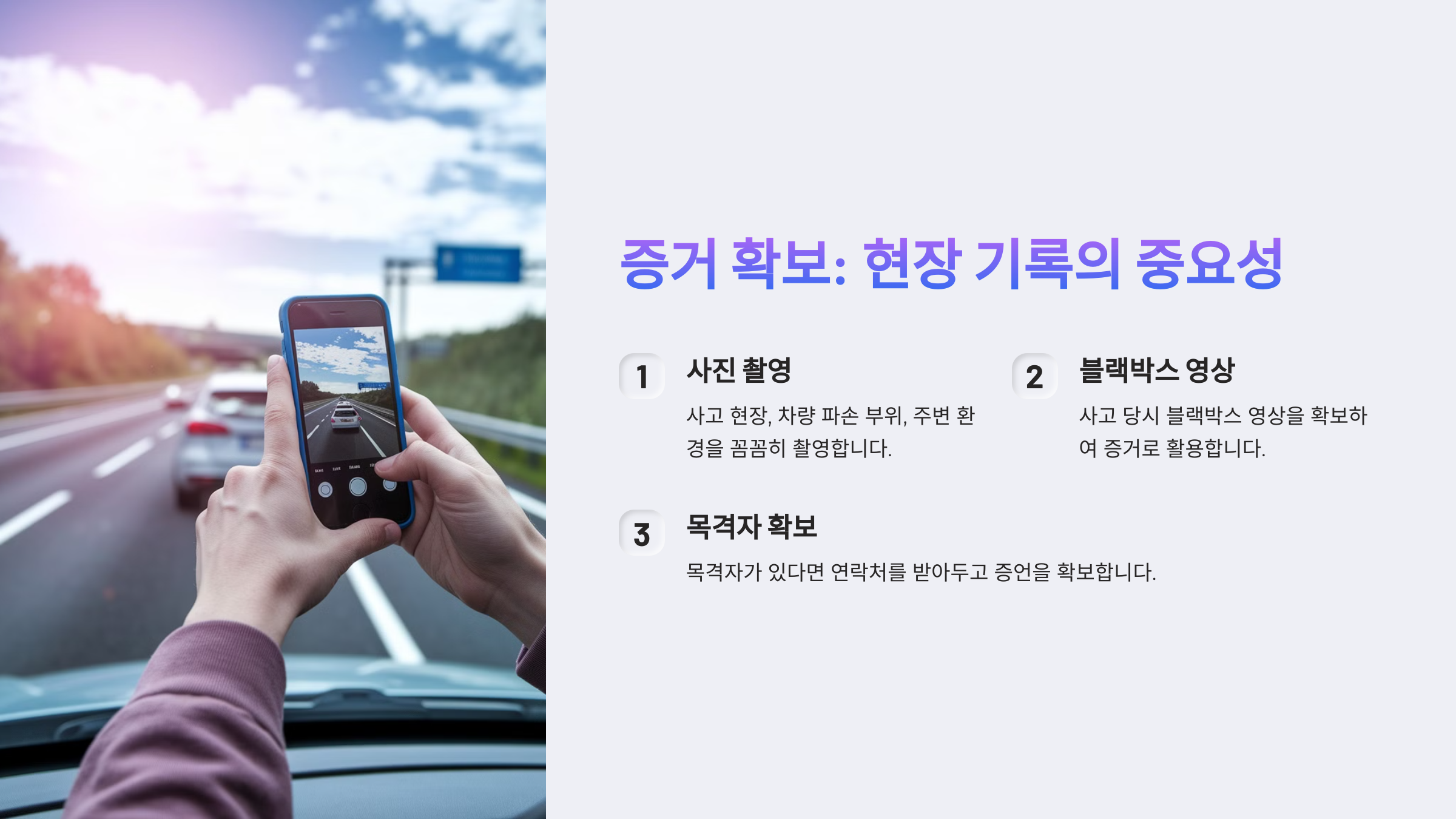 자동차 사고가 발생하면 증거 확보가 가장 중요해요! 🚗⚡ 나중에 과실비율을 따질 때나 보험 처리 시 결정적인 역할을 하니까요.