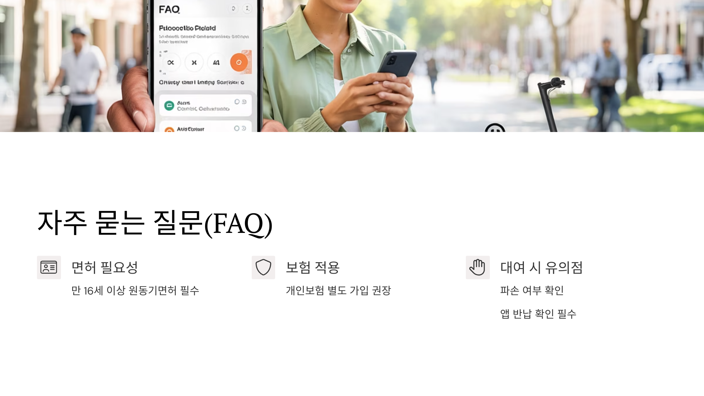 A7. 공유 킥보드도 자전거도로 주행이 가능하지만 헬멧 착용 등 기본 규칙은 동일해요.