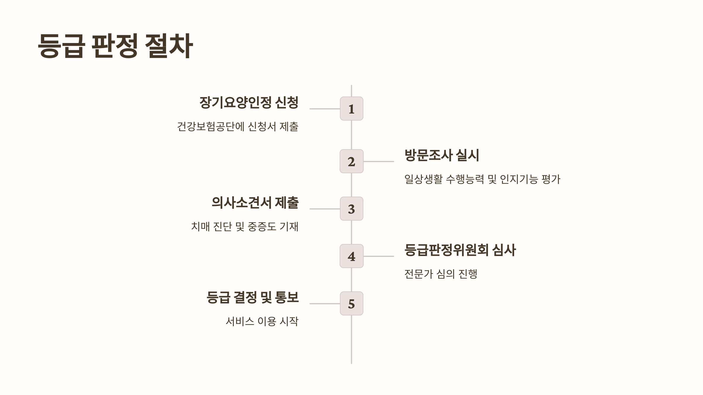 치매 진단을 받았다고 끝이 아니에요! 장기요양등급을 받기 위해서는 꼭 신청 → 조사 → 판정까지 모든 과정을 거쳐야 해요.