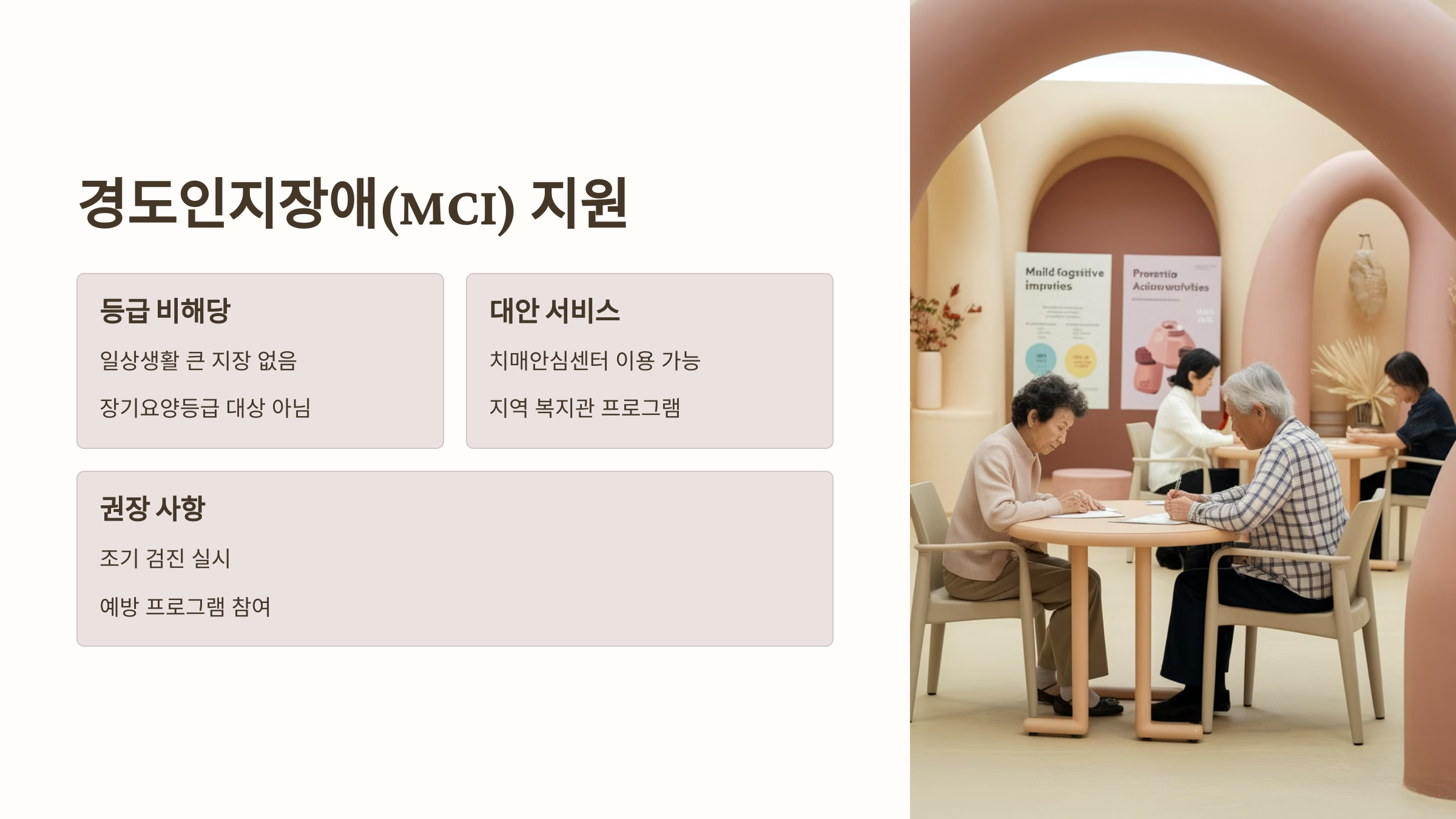 인지지원등급은 경도 치매나 MCI(경도인지장애) 등 가벼운 상태지만 예방적 돌봄이 필요한 경우에 해당돼요.