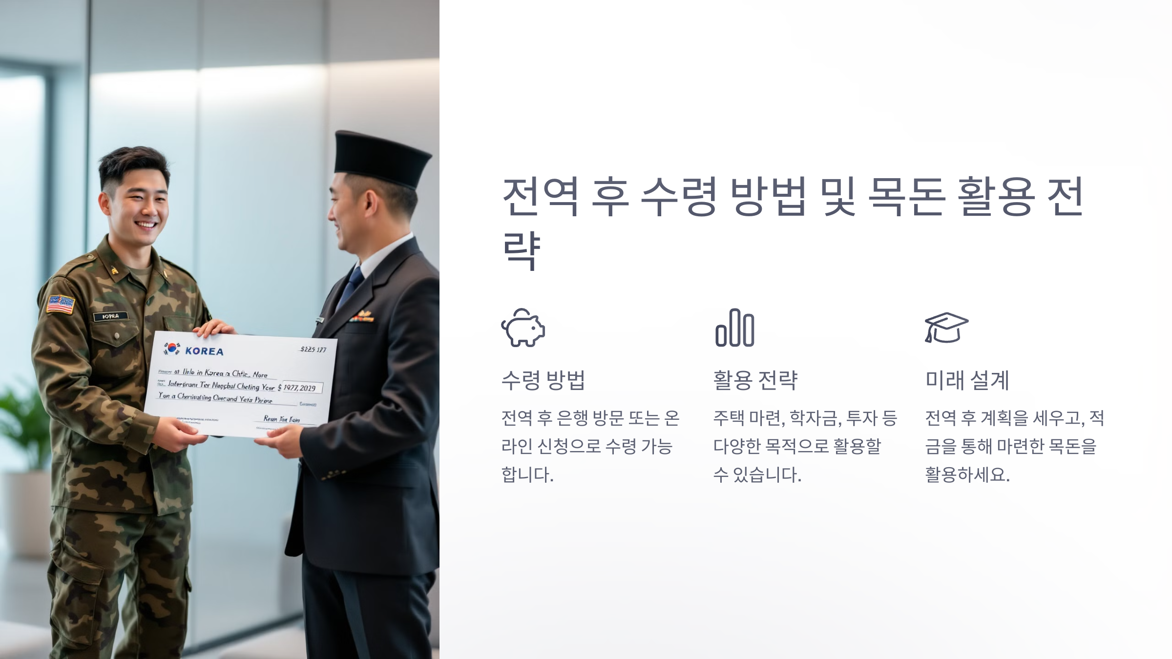 전역 후 이 돈을 어떻게 관리하느냐에 따라 미래가 달라질 수도 있어요! 계획적으로 사용해 보세요.