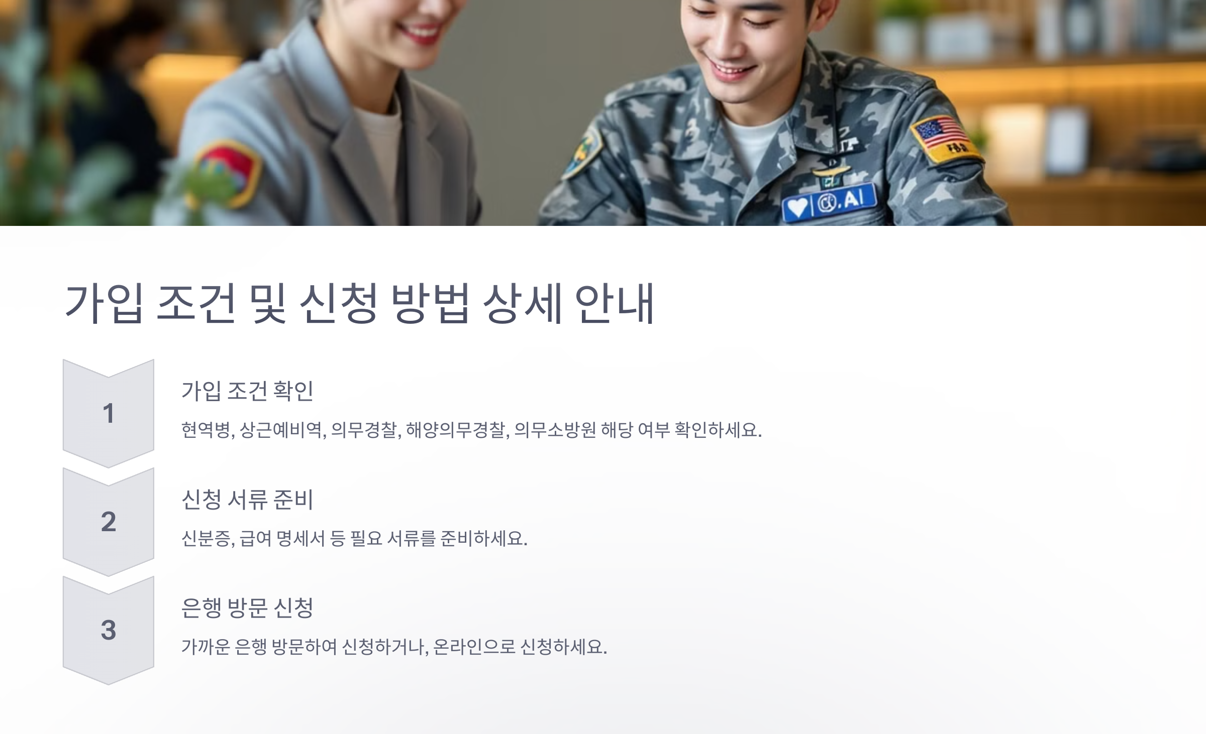 신청할 때는 본인이 현역 병사, 상근예비역, 전환복무자(의무경찰·의무소방·사회복무요원 등)인지 확인해야 해요. 만약 부사관이나 장교는 가입 대상이 아니니 참고하세요!