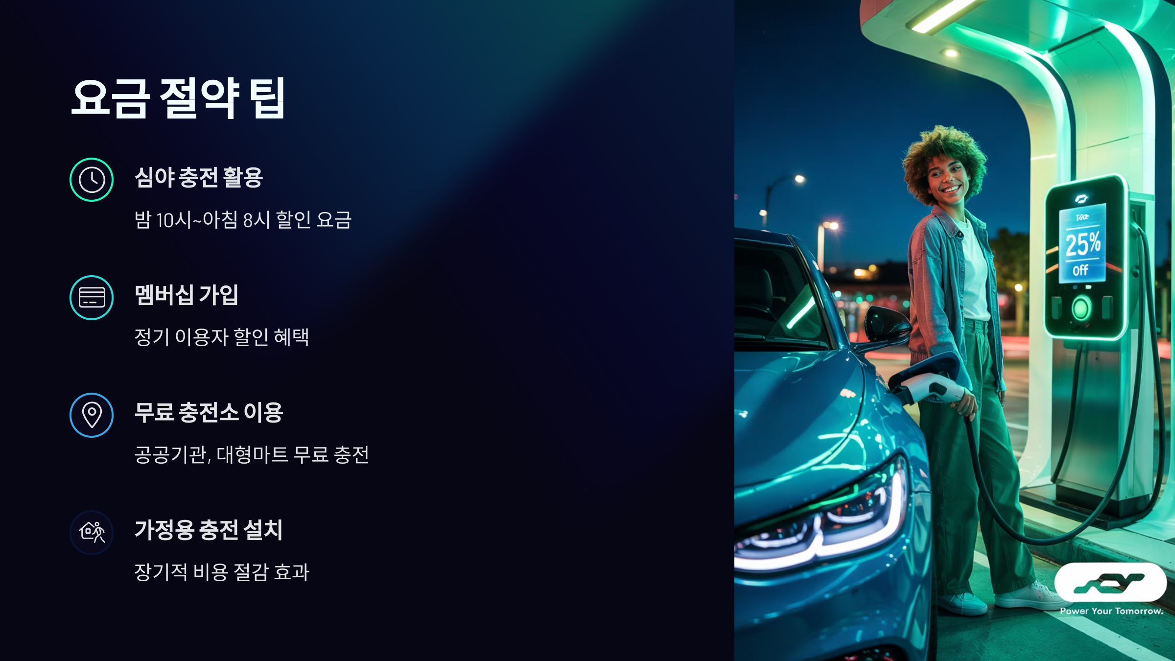 현재 일부 지역만 적용되던 심야 할인 요금제가 전국 확대될 예정이에요. 심야 충전 이용자는 더 큰 할인 혜택을 볼 수 있어요.