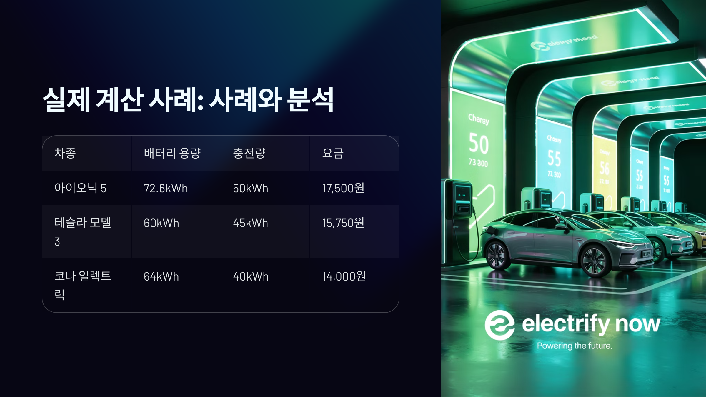 실제로 전기차 충전요금을 계산해보면 훨씬 쉽게 이해할 수 있어요. 이번에는 다양한 조건을 적용한 사례를 통해 실제 금액을 알아볼게요.