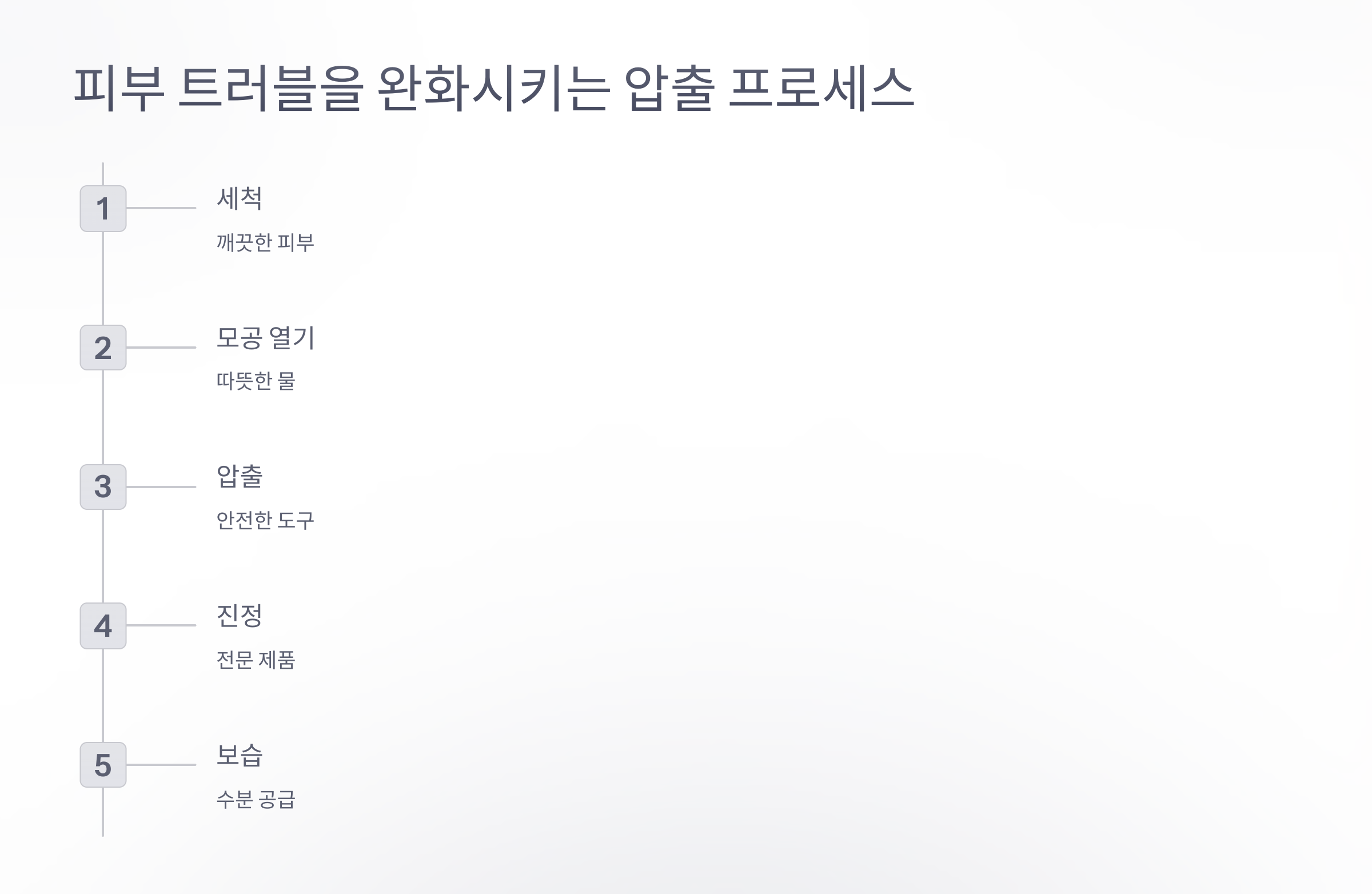 피부 트러블을 줄이기 위해서는 단계별로 정확한 압출 프로세스를 따르는 것이 중요해요. 먼저, 피부를 세정하고 모공을 열어주는 과정이 필요해요. 따뜻한 스팀 타월을 사용하거나 얼굴을 스팀 기계에 가까이 대면 모공이 열려 압출이 더 쉬워져요.