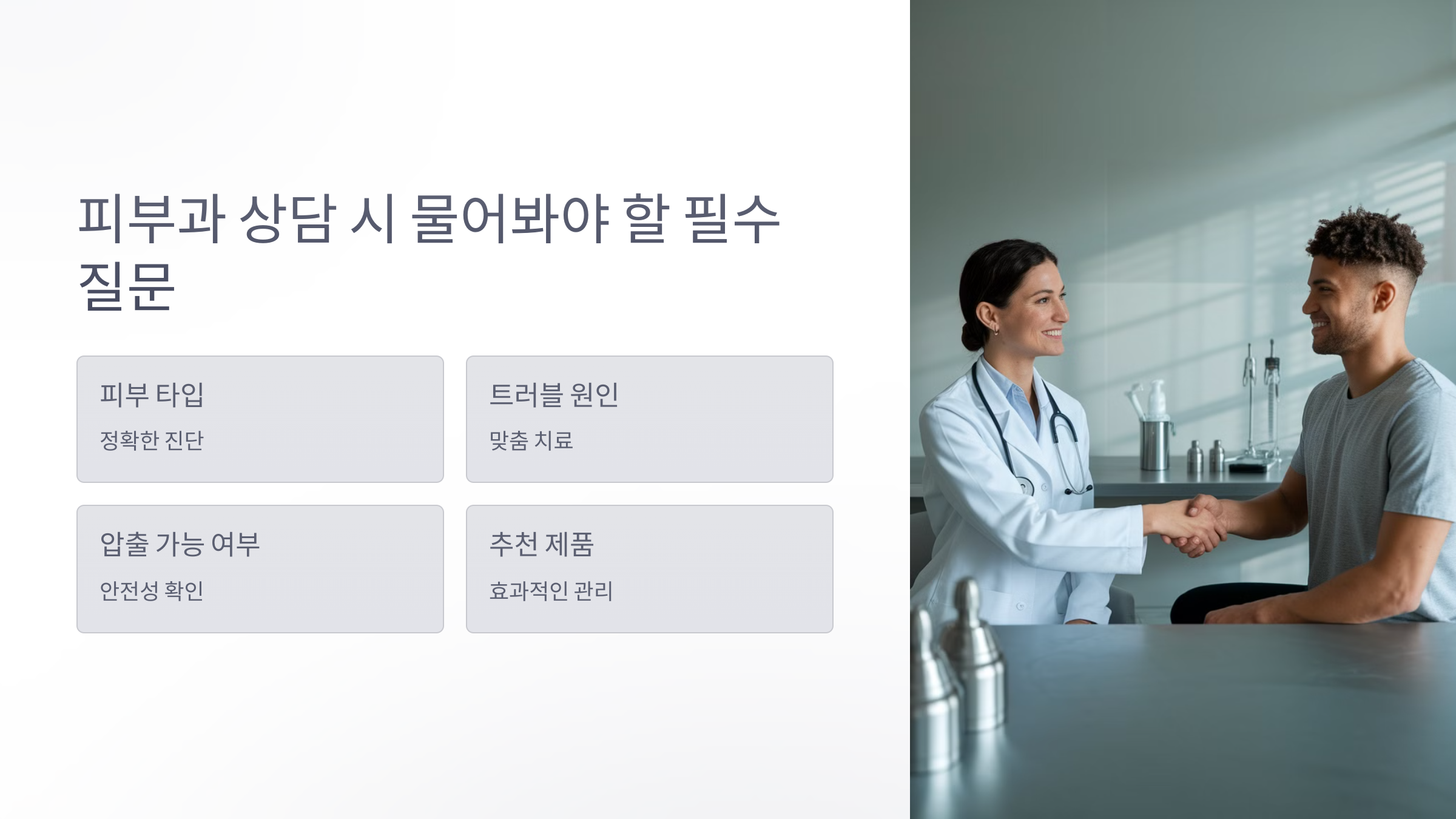 피부과에 방문할 때는 여드름 관리와 관련하여 중요한 질문을 준비하는 것이 좋아요. 우선, "제 피부 상태에 맞는 여드름 관리법은 무엇인가요?"라고 물어보는 것이 좋아요. 이는 개인별 피부 상태에 따라 관리법이 달라지기 때문이에요.