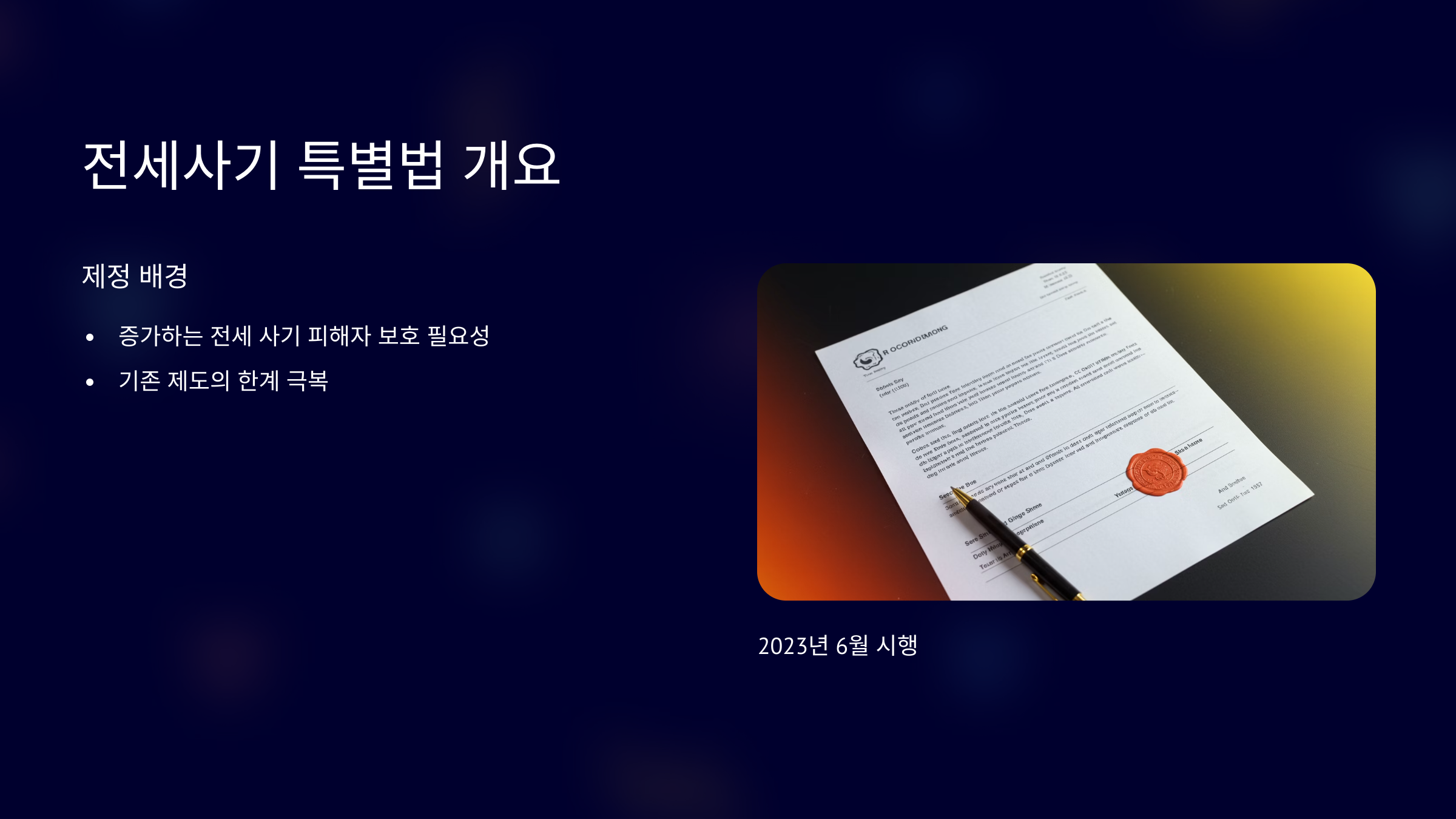 전세사기 특별법은 2022년부터 급증한 전세사기 피해를 막고 피해자를 구제하기 위해 제정되었어요. 당시 빌라왕으로 불리던 김 모 씨 사건, 인천 미추홀구 전세사기 사건 등이 연이어 터지면서 사회적 문제로 대두되었답니다. 정부는 긴급하게 특별법을 제정해 피해자들을 보호하기로 했어요. 이 법의 정식 명칭은 '전세사기피해자 지원 및 주거안정에 관한 특별법'이에요.