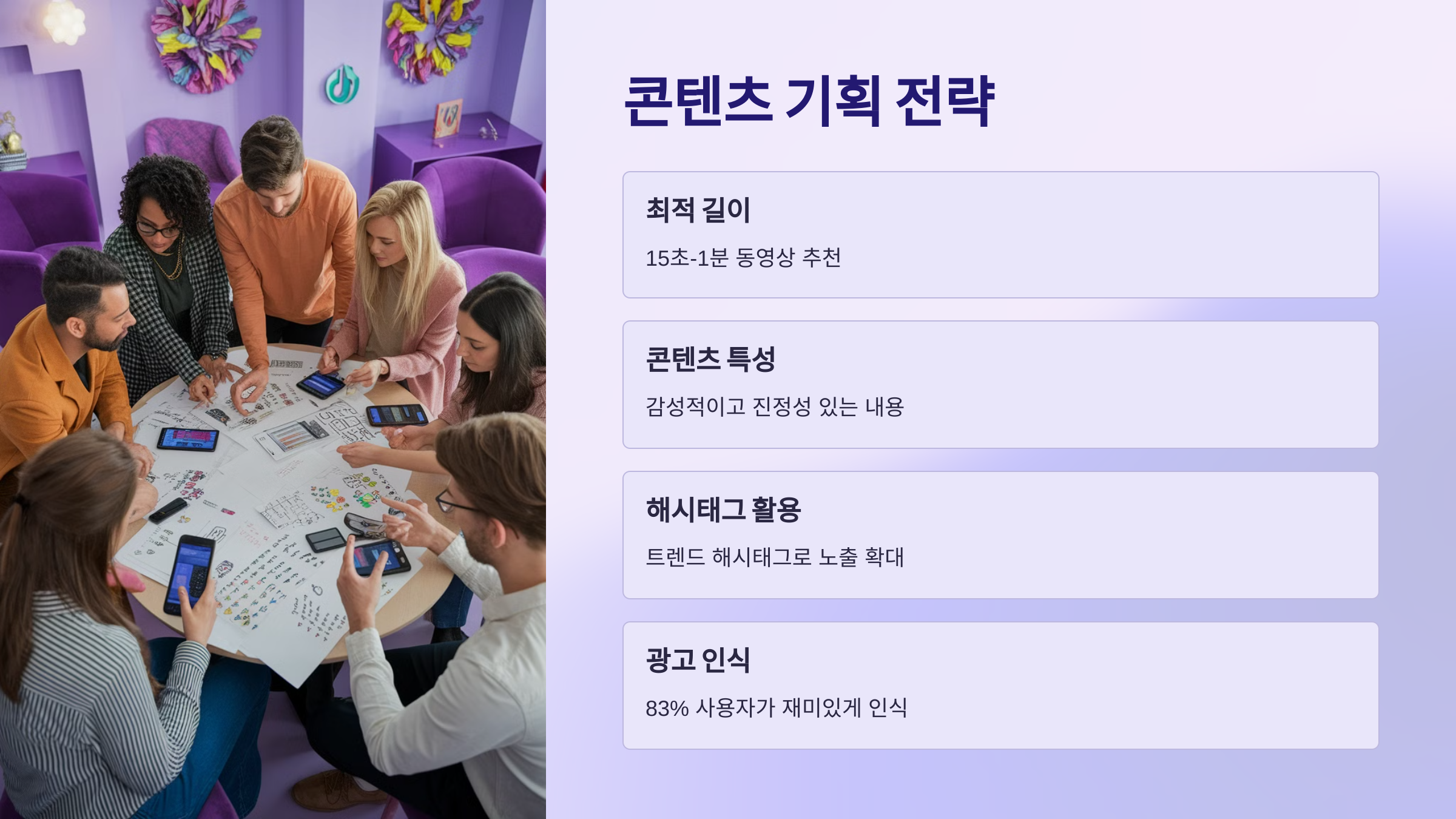틱톡에서 콘텐츠를 기획할 때는 "빠르게 주목받고, 쉽게 이해되며, 바로 반응이 오는" 구조가 핵심이에요. 복잡한 설명보단 시각적, 감정적 요소로 승부하는 게 좋아요.