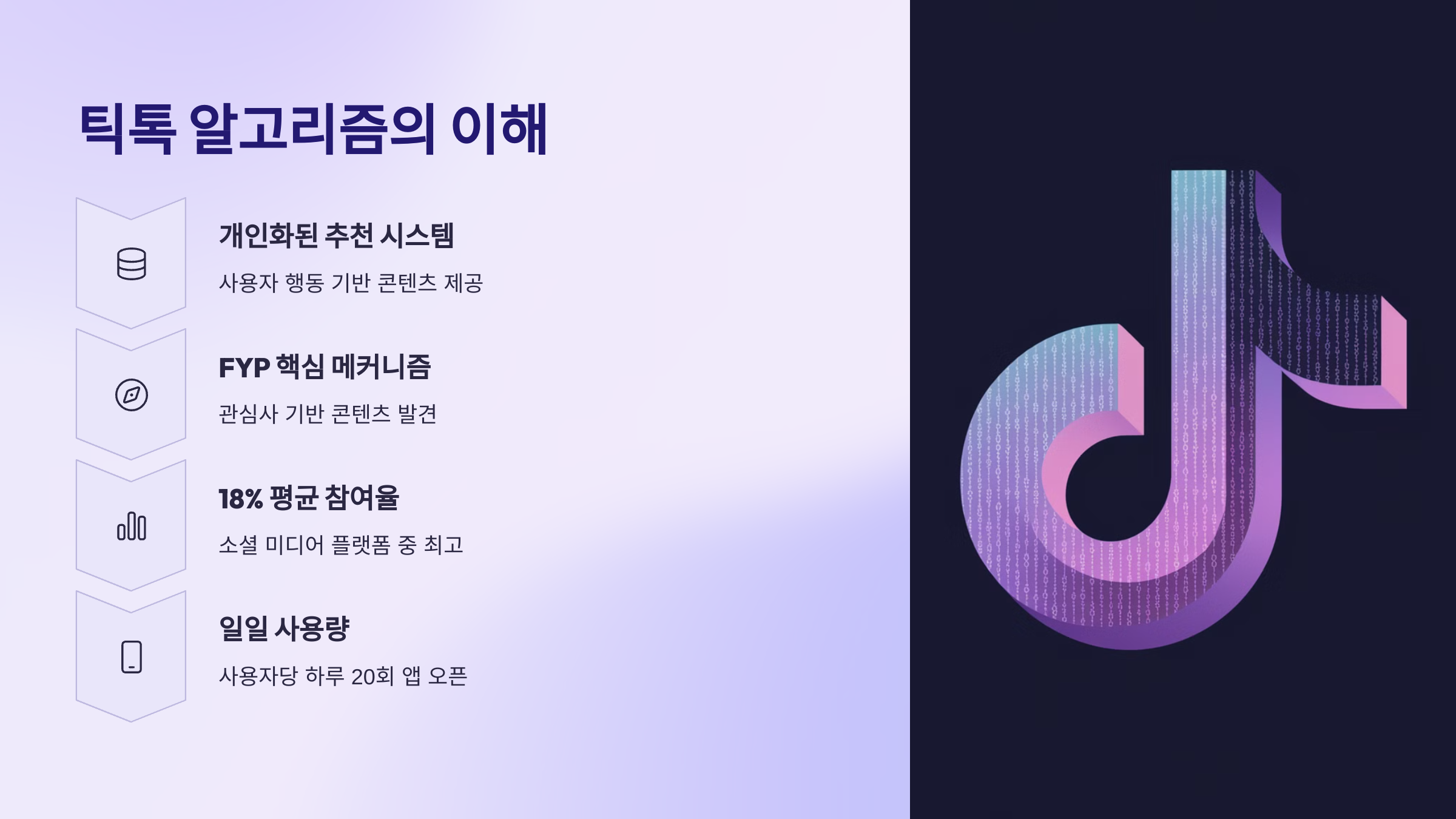 틱톡 알고리즘은 사용자의 관심사, 시청 시간, 반복 재생, 좋아요, 댓글, 저장, 공유 등의 행위를 분석해 비슷한 콘텐츠를 추천해줘요. 즉, 유저가 어떤 콘텐츠에 오래 머무르느냐가 가장 중요한 요소예요.