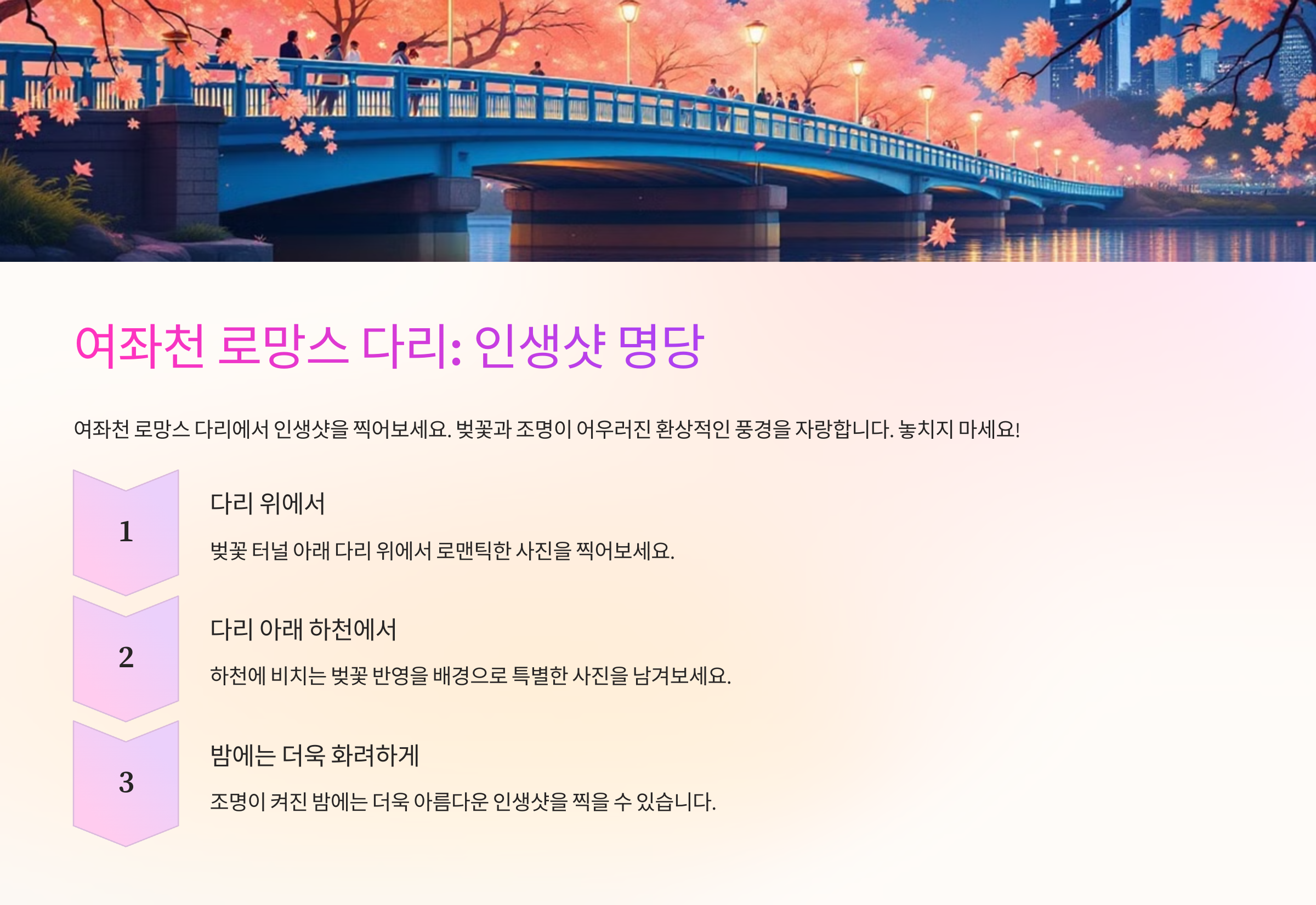 ③ **여좌천 로망스다리** – 조명과 벚꽃이 어우러진 분위기에서 불꽃놀이까지!