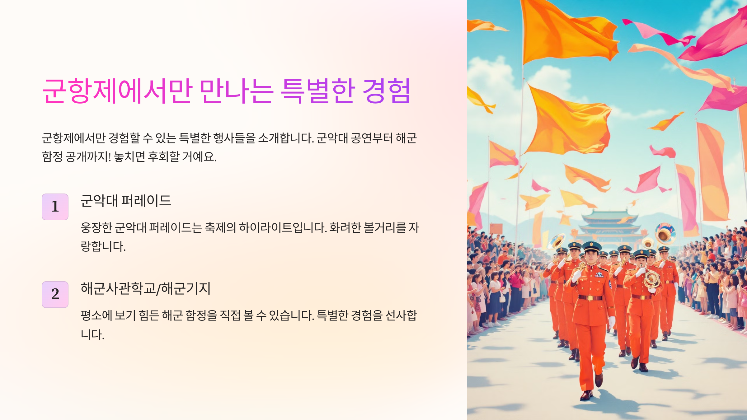 진해군항제는 단순한 벚꽃 축제가 아니에요! 🌸 **해군의 도시**답게 군악대 퍼레이드, 해군사관학교 개방, 함정 공개 행사 등 **오직 이곳에서만 볼 수 있는 특별한 행사**들이 준비되어 있답니다. 🎶