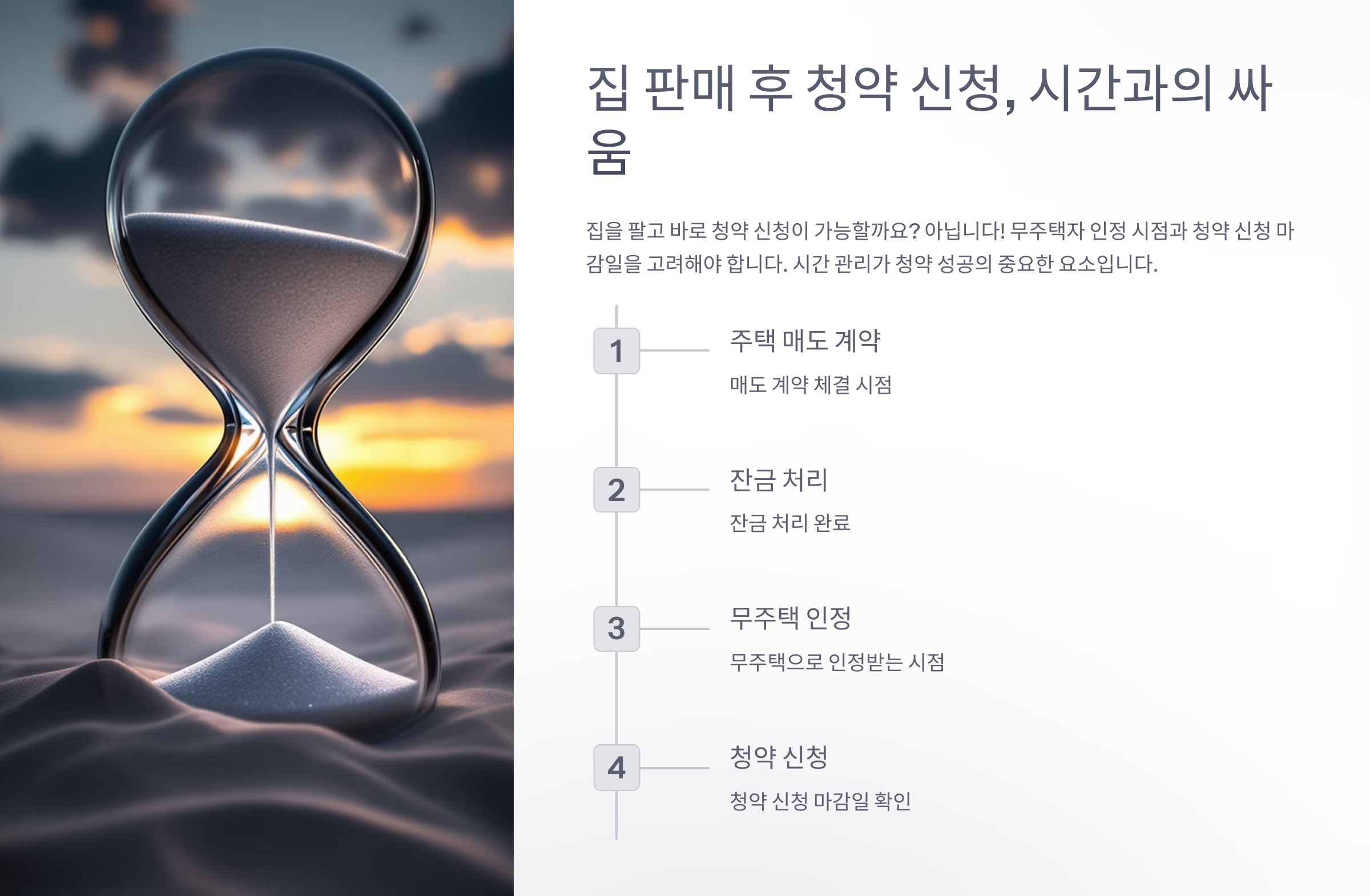 기존 주택을 매도한 후 청약 신청을 하려면 일정 기간이 필요해요. 단순히 계약만 체결한다고 끝나는 것이 아니라, 무주택자로 인정받기 위해서는 몇 가지 절차를 모두 완료해야 해요.