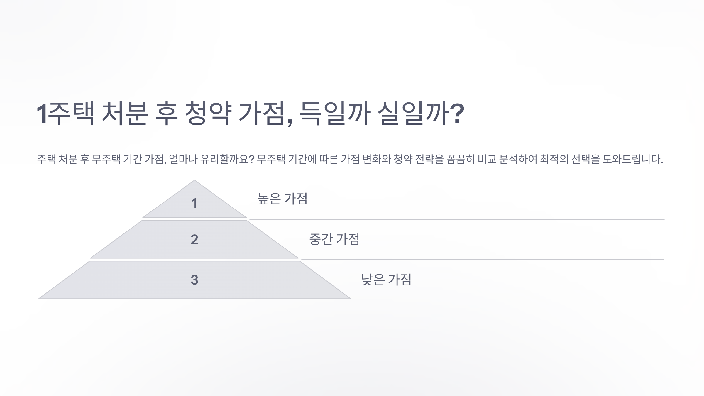 청약 가점은 무주택 기간, 부양가족 수, 청약 통장 가입 기간 세 가지 요소로 결정돼요. 따라서 1주택을 처분하면 무주택 기간이 새로 시작되면서 가점에 영향을 줄 수 있어요.