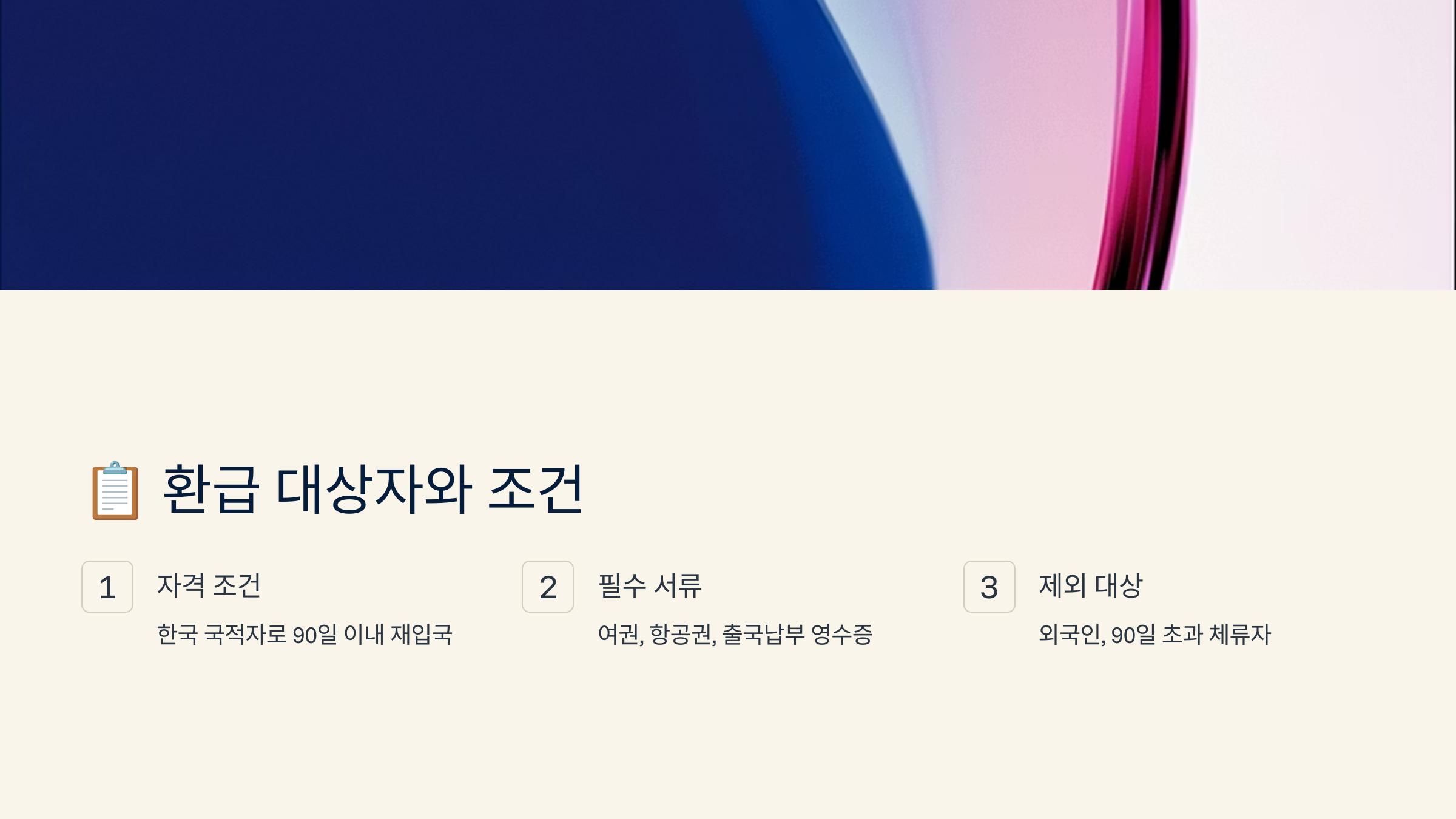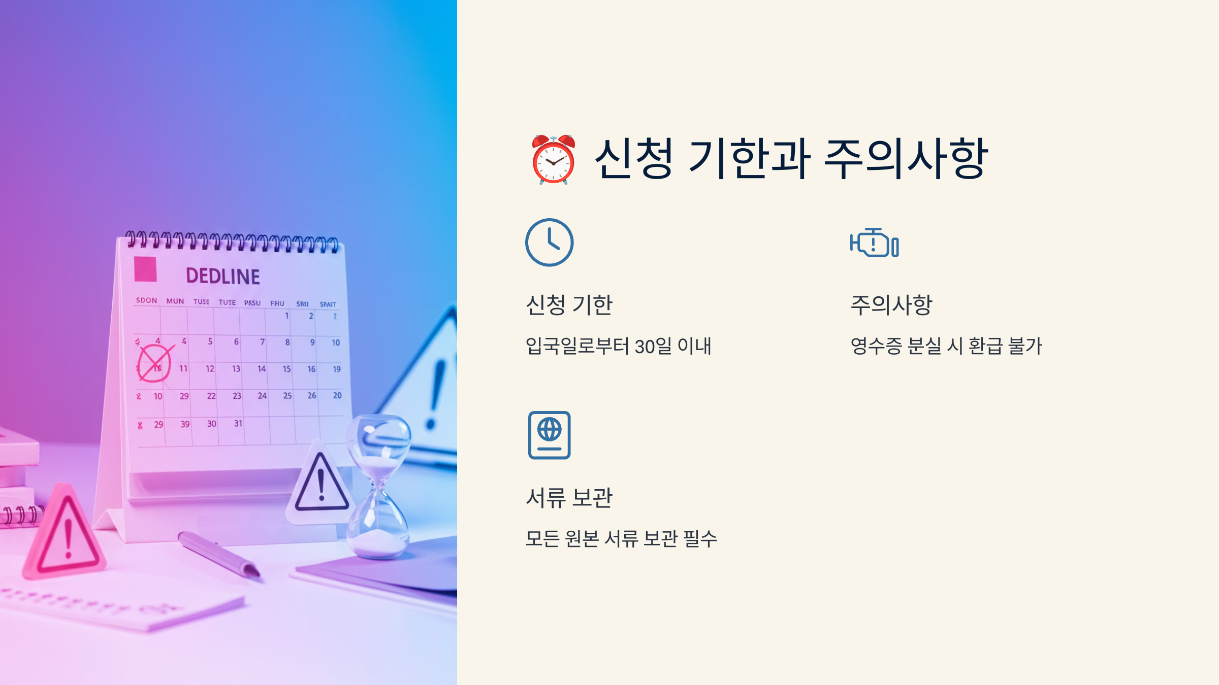 환급 조건을 확인할 때 가장 중요한 것은 출국일 기준으로 자격 요건을 충족해야 한다는 점이에요. 예를 들어, 장애인 등록을 출국 이후에 했다면 환급 대상이 되지 않아요. 반대로 출국 당시에는 자격이 있었지만 현재는 자격이 없어진 경우(예: 기초생활수급 자격 상실)에도 출국 당시 자격을 증명할 수 있다면 환급받을 수 있답니다! 📅