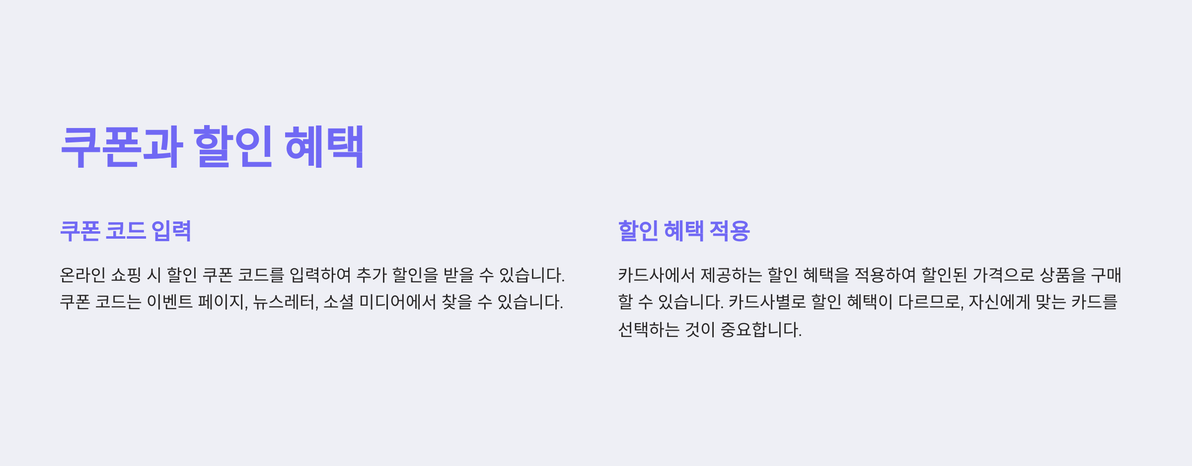또한, 월초와 월말에는 카드사와 연계된 추가 할인을 받을 수 있는 이벤트가 많아요. 카드 등록을 통해 매달 반복되는 할인 혜택을 놓치지 마세요.