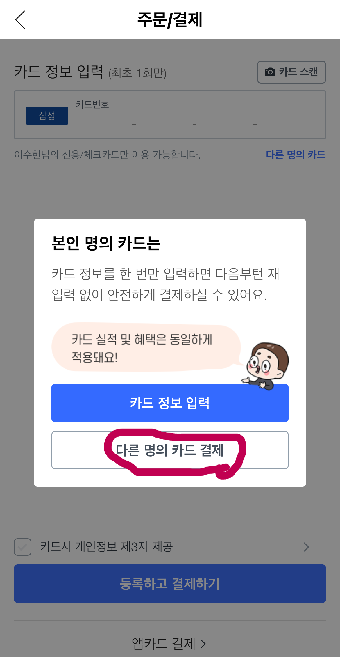 타인 카드로 결제하는 단계