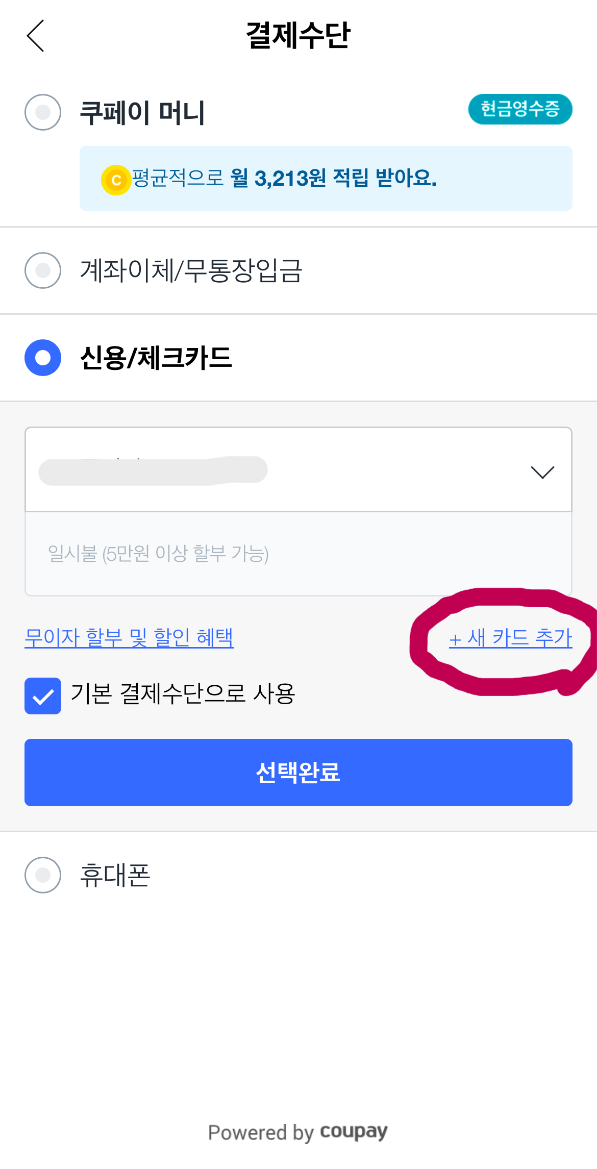 2. 결제 페이지에서 '결제 수단 선택' 섹션누르고 '새 카드 추가'를 선택해요.
