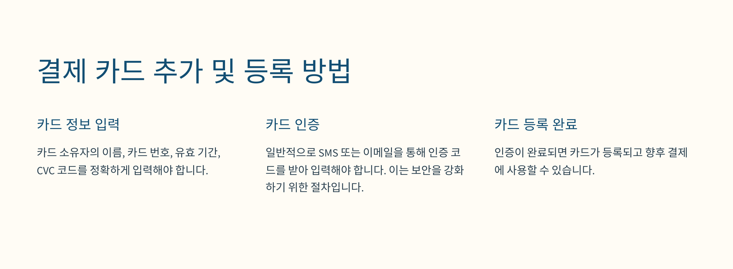 카드를 등록할 때는 카드 번호, 만료일, CVC 코드, 카드 소유자 이름 등이 필요해요. 또한, 본인 인증을 위해 카드 소유자의 휴대전화 번호로 인증 절차가 진행될 수 있으니 카드 소유자와 미리 상의하세요.